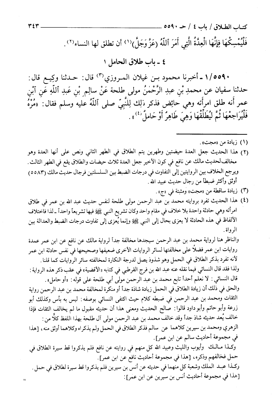 5590 - أخبرنا محمود بن غيلان المروزي قال حدثنا وكيع قال حدثنا سفيان عن محمد بن عبد الرحمن مولى طلحة عن سالم بن عبد الله عن بن عمر : أنه طلق امرأته وهي حائض فذكر ذلك للنبي صلى الله عليه و سلم فقال مره فليراجعها ثم ليطلقها وهي طاهر أو حامل