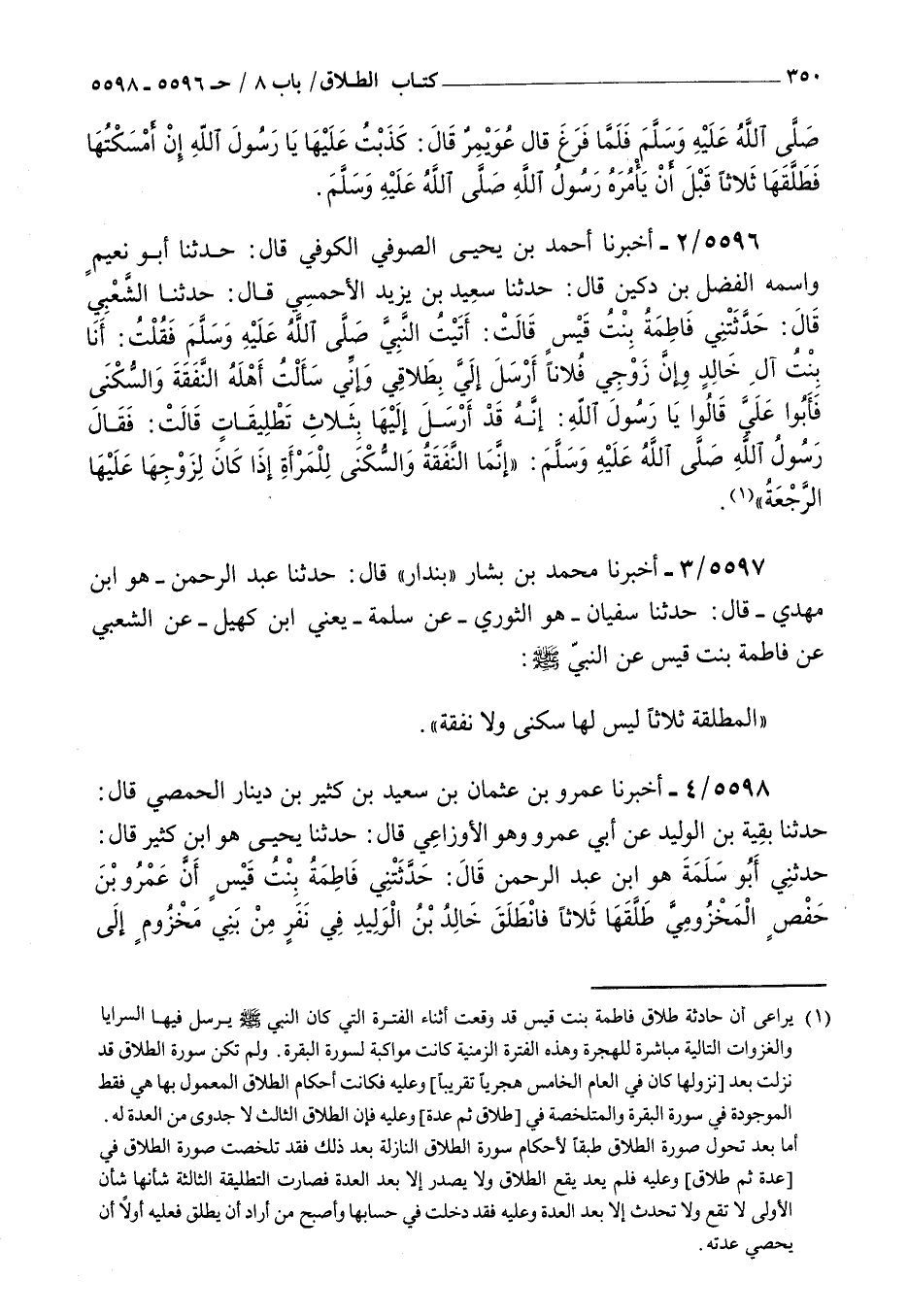5597 - أخبرنا محمد بن بشار بندار قال حدثنا عبد الرحمن هو بن مهدي قال حدثنا سفيان هو الثوري عن سلمة يعني بن كهيل عن الشعبي عن فاطمة بنت قيس عن النبي صلى الله عليه و سلم : المطلقة ثلاثا ليس لها سكنى ولا نفقة