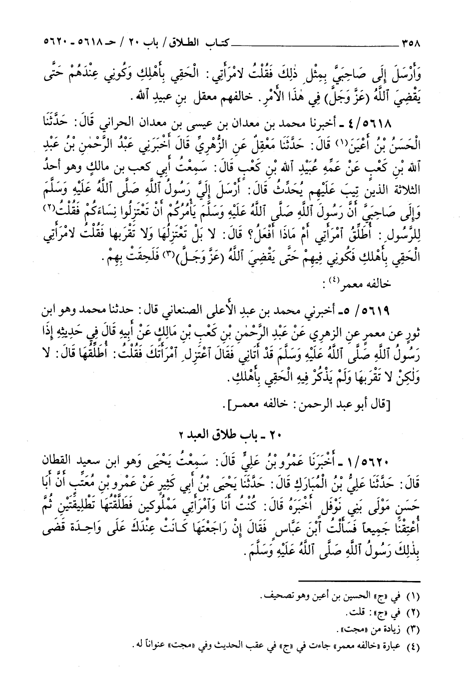 5620 - أخبرنا عمرو بن علي قال سمعت يحيى وهو بن سعيد القطان قال حدثنا علي بن المبارك قال حدثنا يحيى بن أبي كثير عن عمرو بن معتب أن أبا حسن مولى بني نوفل أخبره قال : كنت أنا وامرأتي مملوكين فطلقتها تطليقتين ثم أعتقنا جميعا فسألت بن عباس فقال إن راجعتها كانت عندك على واحدة قضى بذلك رسول الله صلى الله عليه و سلم خالفه معمر