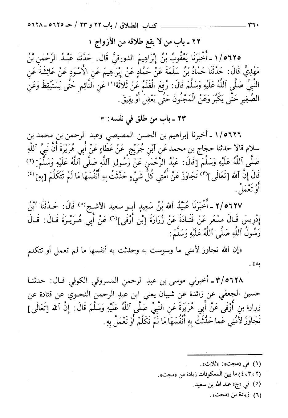 5628 - أخبرني موسى بن عبد الرحمن المسروقي الكوفي قال حدثنا حسين الجعفي عن زائدة عن شيبان يعني بن عبد الرحمن النحوي عن قتادة عن زرارة بن أوفى عن أبي هريرة عن النبي صلى الله عليه و سلم قال : إن الله تعالى تجاوز لأمتي عما حدثت به أنفسها ما لم تكلم أو تعمل به