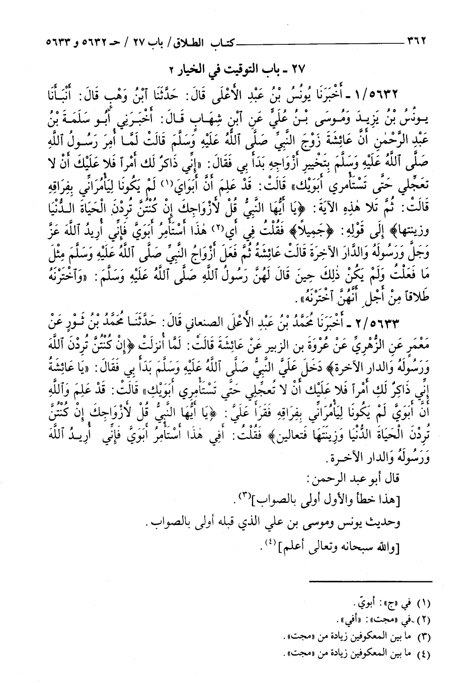 5633 - أخبرنا محمد بن عبد الأعلى الصنعاني قال حدثنا محمد بن ثور عن معمر عن الزهري عن عروة بن الزبير عن عائشة قالت : لما أنزلت { إن كنتن تردن الله ورسوله والدار الآخرة } دخل علي النبي صلى الله عليه و سلم بدأ بي فقال يا عائشة إني ذاكر لك أمرا فلا عليك أن لا تعجلي حتى تستأمري أبويك قالت قد علم والله أن أبوي لم يكونا ليأمراني بفراقه فقرأ علي { يا أيها النبي قل لأزواجك إن كنتن تردن الحياة الدنيا وزينتها فتعالين } فقلت أفي هذا أستأمر أبوي فإني أريد الله ورسوله والدار الآخرة قال أبو عبد الرحمن هذا خطأ والأول أولى بالصواب وحديث يونس وموسى بن علي الذي قبله أولى بالصواب والله سبحانه وتعالى أعلم