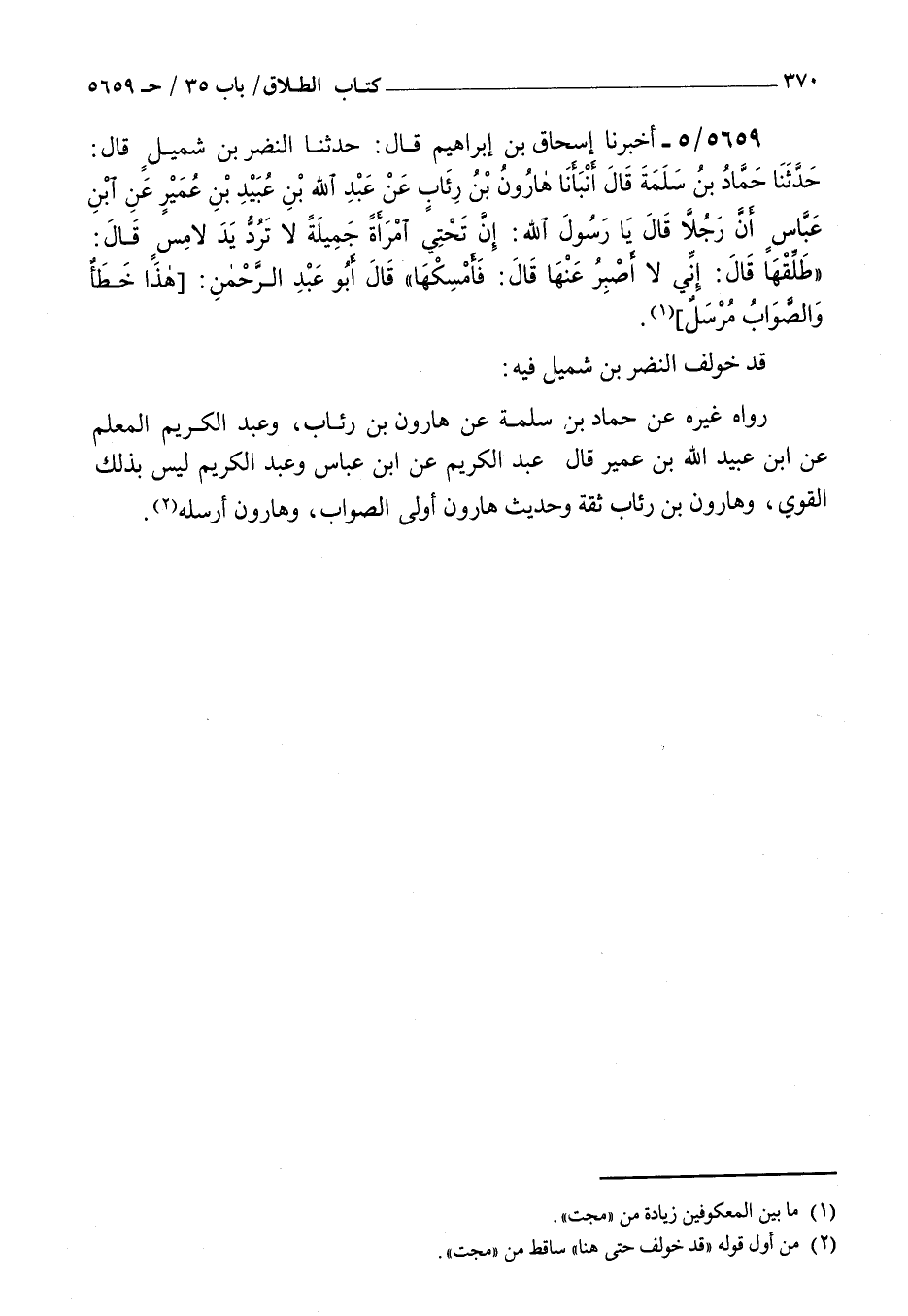 5659 - أخبرنا إسحاق بن إبراهيم قال حدثنا النضر بن شميل قال حدثنا حماد بن سلمة قال أنبأنا هارون بن رئاب عن عبد الله بن عبيد بن عمير عن بن عباس أن رجلا قال: يا رسول الله إن تحتي امرأة جميلة لا ترد يد لامس قال طلقها قال إني لا أصبر عنها قال فأمسكها قال أبو عبد الرحمن هذا خطأ والصواب مرسل قد خولف النضر بن شميل فيه رواه غيره عن حماد بن سلمة عن هارون بن رئاب وعبد الكريم المعلم عن بن عبيد الله بن عمير قال عبد الكريم عن بن عباس وعبد الكريم ليس بذلك القوي وهارون بن رئاب ثقة وحديث هارون أولى الصواب وهارون أرسله
