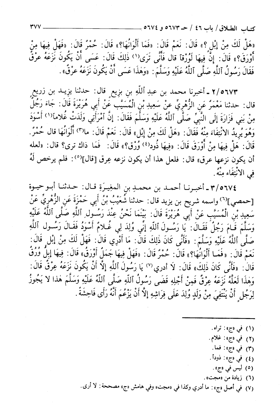 5674 - أخبرنا أحمد بن محمد بن المغيرة قال حدثنا أبو حيوة حمصي واسمه شريح بن يزيد قال حدثنا شعيب بن أبي حمزة عن الزهري عن سعيد بن المسيب عن أبي هريرة قال : بينما نحن عند رسول الله صلى الله عليه و سلم قام رجل فقال يا رسول الله إني ولد لي غلام أسود فقال رسول الله صلى الله عليه و سلم فأنى كان ذلك قال ما أدري قال فهل لك من إبل قال نعم قال فما ألوانها قال حمر قال فهل فيها جمل أورق قال فيها إبل ورق قال فأنى كان ذلك قال لا أدري يا رسول الله إلا أن يكون نزعه عرق قال وهذا لعله نزعه عرق فمن أجله قضى رسول الله صلى الله عليه و سلم هذا لا يجوز لرجل أن ينتفي من ولد ولد على فراشه إلا أن يزعم أنه رأى فاحشة