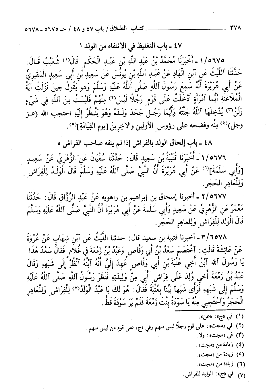 5676 - أخبرنا قتيبة بن سعيد قال حدثنا سفيان عن الزهري عن سعيد وأبي سلمة عن أبي هريرة أن النبي صلى الله عليه و سلم قال : الولد للفراش وللعاهر الحجر