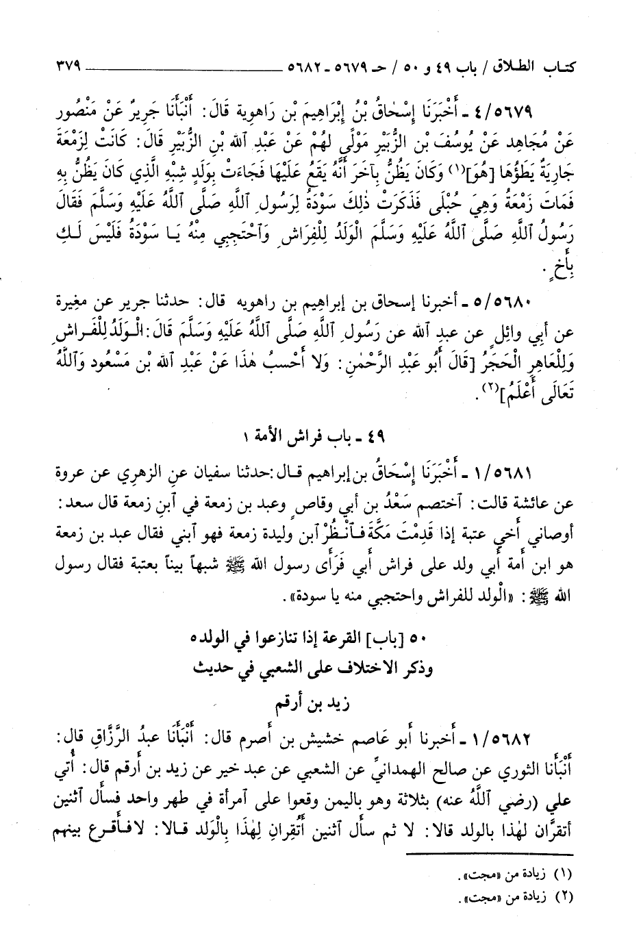 5679 - أخبرنا إسحاق بن إبراهيم بن راهويه قال أنبأنا جرير عن منصور عن مجاهد عن يوسف بن الزبير مولى لهم عن عبد الله بن الزبير قال : كانت لزمعة جارية يطؤها هو وكان يظن بآخر أنه يقع عليها فجاءت بولد شبه الذي كان يظن به فمات زمعة وهي حبلى فذكرت ذلك سودة لرسول الله صلى الله عليه و سلم فقال رسول الله صلى الله عليه و سلم الولد للفراش واحتجبي منه يا سودة فليس لك بأخ
