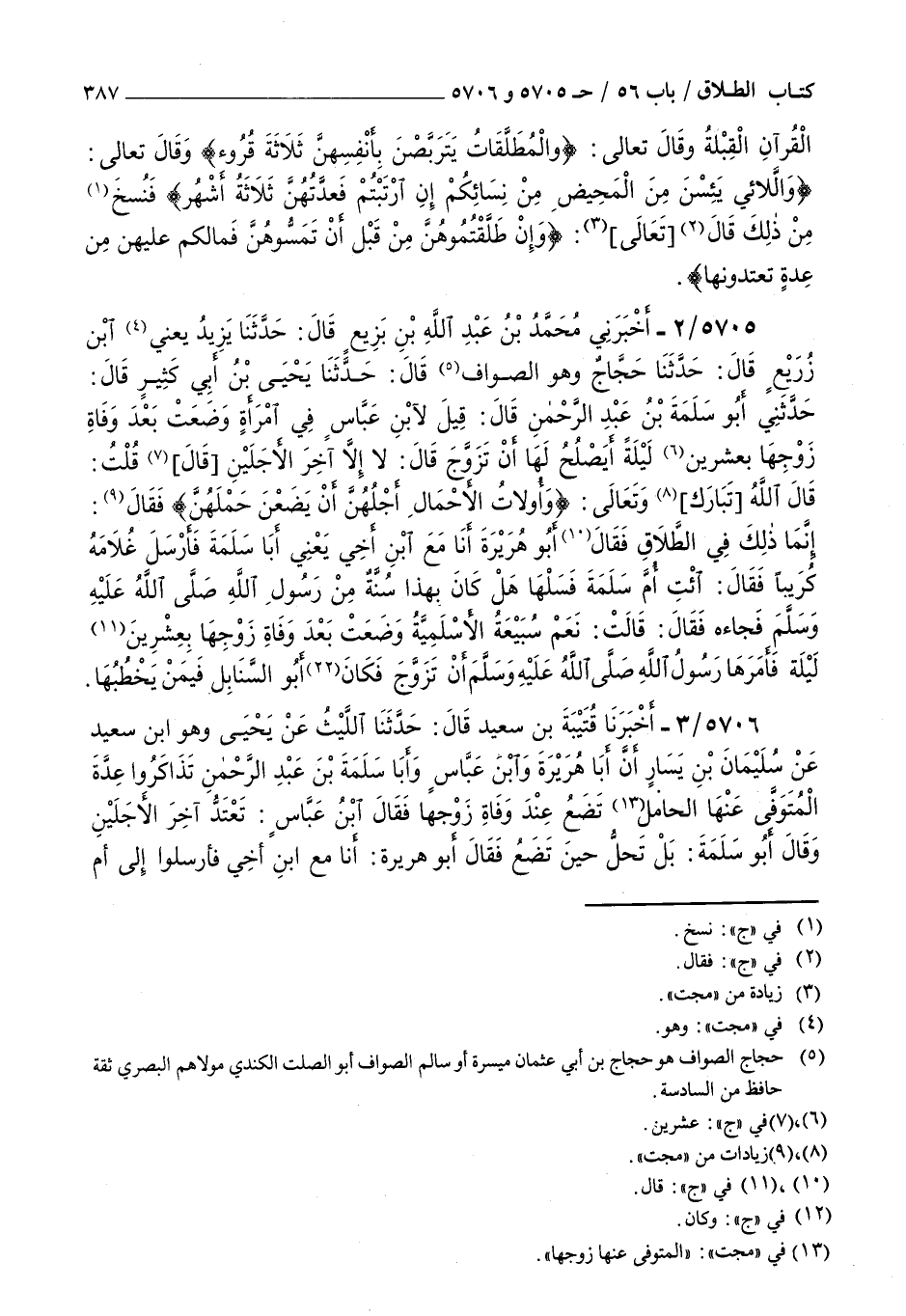 5705 - أخبرني محمد بن عبد الله بن بزيع قال حدثنا يزيد يعني بن زريع قال حدثنا حجاج وهو الصواف قال حدثنا يحيى بن أبي كثير قال حدثني أبو سلمة بن عبد الرحمن قال قيل لابن عباس : في امرأة وضعت بعد وفاة زوجها بعشرين ليلة أيصلح لها أن تزوج قال لا إلا آخر الأجلين قال قلت قال الله تبارك وتعالى وأولات الأحمال أجلهن أن يضعن حملهن فقال إنما ذلك في الطلاق فقال أبو هريرة أنا مع بن أخي يعني أبا سلمة فأرسل غلامه كريبا فقال أئت أم سلمة فسلها هل كان بهذا سنة من رسول الله صلى الله عليه و سلم فجاءه فقال قالت نعم سبيعة الأسلمية وضعت بعد وفاة زوجها بعشرين ليلة فأمرها رسول الله صلى الله عليه و سلم أن تزوج فكان أبو السنابل فيمن يخطبها
