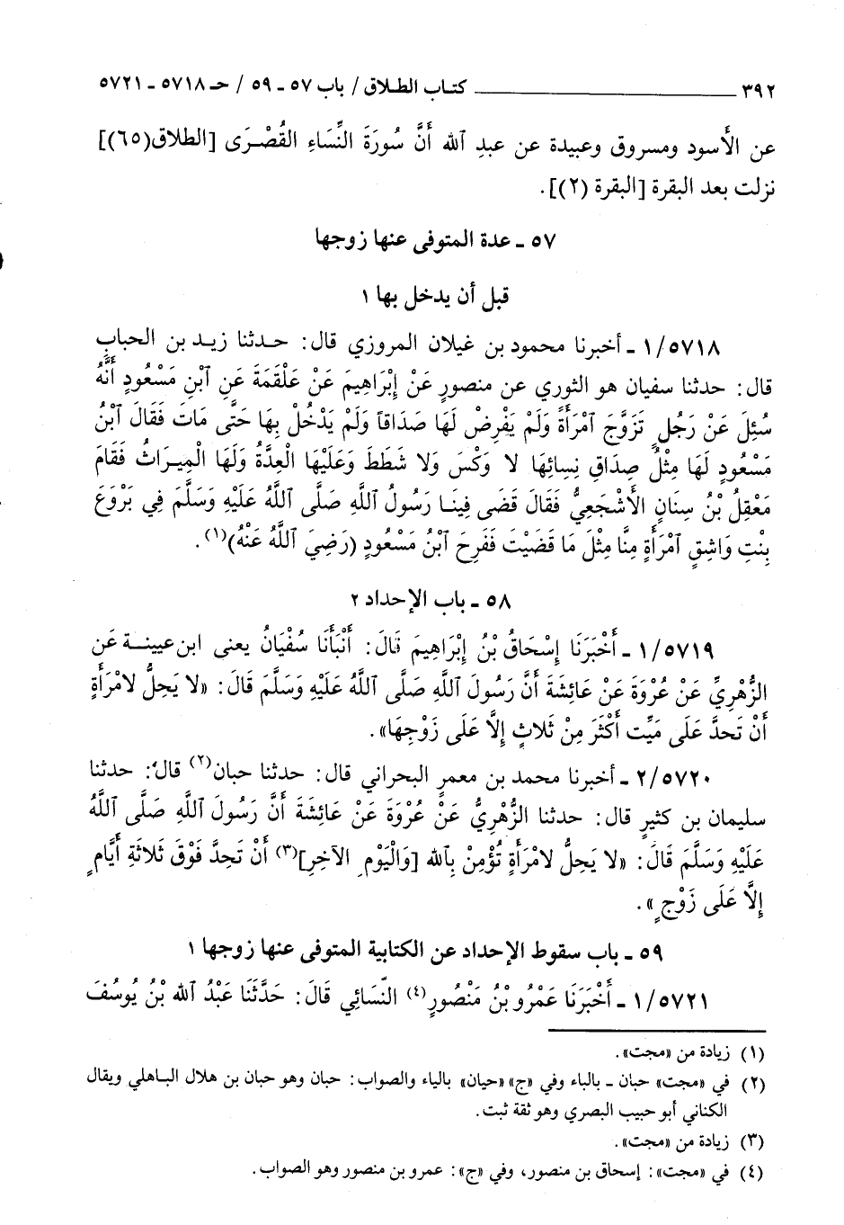5719 - أخبرنا إسحاق بن إبراهيم قال أنبأنا سفيان يعني بن عيينة عن الزهري عن عروة عن عائشة أن رسول الله صلى الله عليه و سلم قال : لا يحل لامرأة أن تحد على ميت أكثر من ثلاث إلا على زوجها