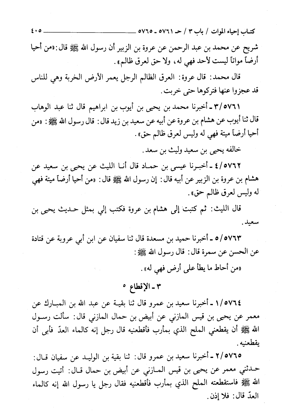 5762 - أخبرنا عيسى بن حماد قال أنا الليث عن يحيى بن سعيد عن هشام بن عروة بن الزبير عن أبيه قال إن رسول الله صلى الله عليه و سلم قال : من أحيا أرضا ميتة فهي له وليس لعرق ظالم حق قال الليث ثم كتبت إلى هشام بن عروة فكتب إلي بمثل حديث يحيى بن سعيد
