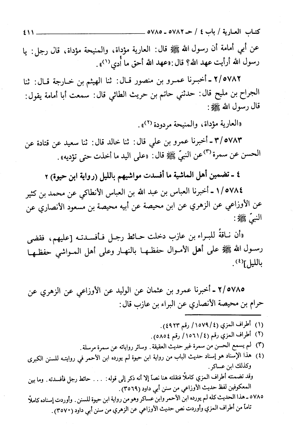 5782 - أخبرنا عمرو بن منصور قال ثنا الهيثم بن خارجة قال ثنا الجراح بن مليح قال حدثني حاتم بن حريث الطائي قال سمعت أبا أمامة يقول قال رسول الله صلى الله عليه و سلم : العارية مؤداة والمنيحة مردودة