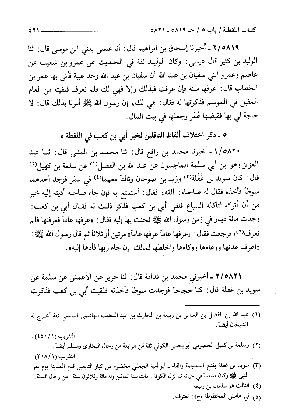 5820 - أخبرنا محمد بن رافع قال ثنا محمد بن المثنى قال ثنا عبد العزيز وهو بن أبي سلمة الماجشون عن عبد الله بن الفضل عن سلمة بن كهيل قال : كان سويد بن غفلة وزيد بن صوحان وثالثا معهما في سفر فوجد أحدهما سوطا فأخذه فقال له صاحباه ألقه فقال استمتع به فإن جاء صاحبه أديته إليه خير من أن أتركه لتأكله السباع فلقي أبي بن كعب فذكر ذلك له فقال أبي بن كعب وجدت مائة دينار في زمن رسول الله صلى الله عليه و سلم فجئت بها إليه فقال عرفها عاما فعرفتها فلم تعرف فرجعت فقال عرفها عاما عرفها عاما مرتين أو ثلاثا ثم قال رسول الله صلى الله عليه و سلم اعرف عدتها ووعاءها ووكاءها واخلطها لمالك فإن جاء ربها فأدها إليه
