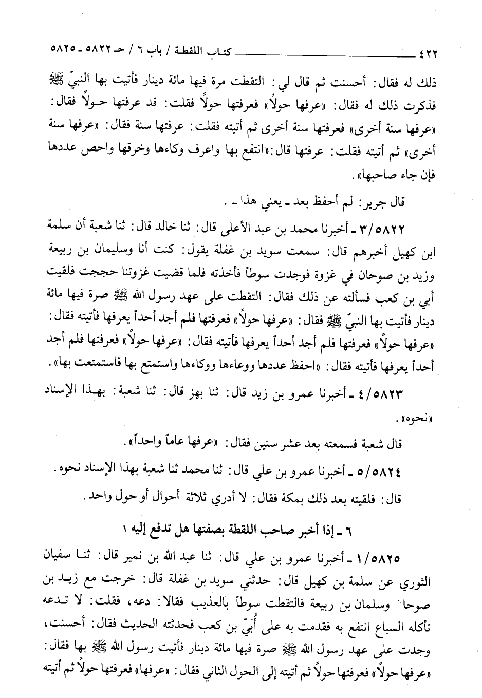 5825 - أخبرنا عمرو بن علي قال ثنا عبد الله بن نمير قال ثنا سفيان الثوري عن سلمة بن كهيل قال حدثني سويد بن غفلة قال : خرجت مع زيد بن صوحان وسلمان بن ربيعة فالتقطت سوطا بالعذيب فقالا دعه فقلت لا تدعه تأكله السباع انتفع به فقدمت به على أبي بن كعب فحدثته الحديث فقال أحسنت وجدت على عهد رسول الله صلى الله عليه و سلم صرة فيها مائة دينار فأتيت رسول الله صلى الله عليه و سلم بها فقال عرفها حولا فعرفتها حولا ثم أتيته إلى الحول الثاني فقال عرفها فعرفتها حولا ثم أتيته فقال عرفها فعرفتها ثم أتيته الثالث فقال اعلم عدتها ووعاءها ووكاءها فإن جاء أحد يخبر بعددها ووعائها ووكائها فأعطها إياه وإلا فاستنفع بها