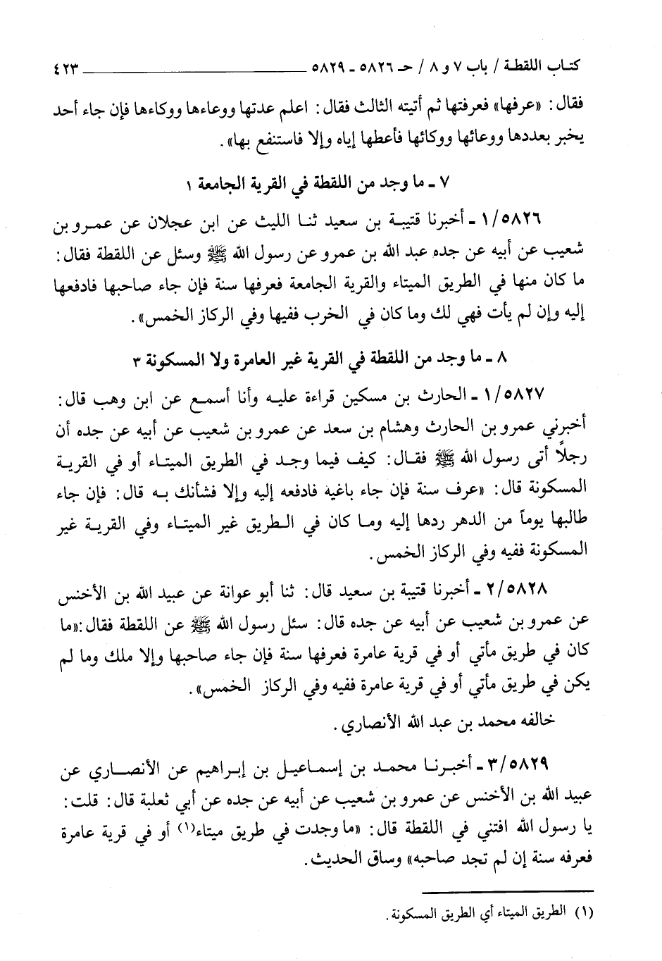 5828 - أخبرنا قتيبة بن سعيد قال ثنا أبو عوانة عن عبيد الله بن الأخنس عن عمرو بن شعيب عن أبيه عن جده قال : سئل رسول الله صلى الله عليه و سلم عن اللقطة فقال ما كان في طريق نأتي أو في قرية عامره فعرفها سنة فإن جاء صاحبها وإلا ملك وما لم يكن في طريق مأتي أو في قرية عامره ففيه وفي الركاز الخمس خالفه محمد بن عبد الله الأنصاري