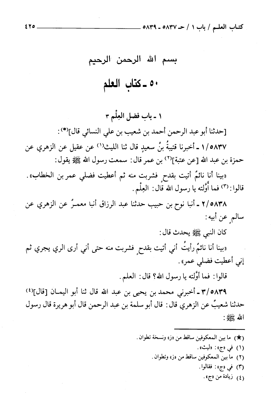 5837 - أخبرنا قتيبة بن سعيد قال ثنا الليث عن عقيل عن الزهري عن حمزة بن عبد الله عن عتبة بن عمر قال سمعت رسول الله صلى الله عليه و سلم يقول : بينا أنا نائم أتيت بقدح فشربت منه ثم أعطيت فضلي عمر بن الخطاب قالوا فما أولته يا رسول الله قال العلم