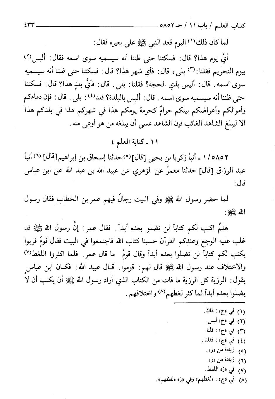 5852 - أنبأ زكريا بن يحيى قال حدثنا إسحاق بن إبراهيم قال أنبأ عبد الرزاق قال حدثنا معمر عن الزهري عن عبيد الله بن عبد الله عن بن عباس قال : لما حضر رسول الله صلى الله عليه و سلم وفي البيت رجال فيهم عمر بن الخطاب فقال رسول الله صلى الله عليه و سلم هلم اكتب لكم كتابا لن تضلوا بعده أبدا فقال عمر إن رسول الله صلى الله عليه و سلم قد غلب عليه الوجع وعندكم القرآن حسبنا كتاب الله فاجتمعوا في البيت فقال قوم قربوا يكتب لكم كتابا لن تضلوا بعده أبدا وقال قوم ما قال عمر فلما أكثروا اللغط والاختلاف عند رسول الله صلى الله عليه و سلم قال لهم قوموا قال عبيد الله فكان بن عباس يقول الرزية كل الرزية ما فات من الكتاب الذي أراد رسول الله صلى الله عليه و سلم أن يكتب أن لا يضلوا بعده أبدا لما كثر لغطهم واختلافهم