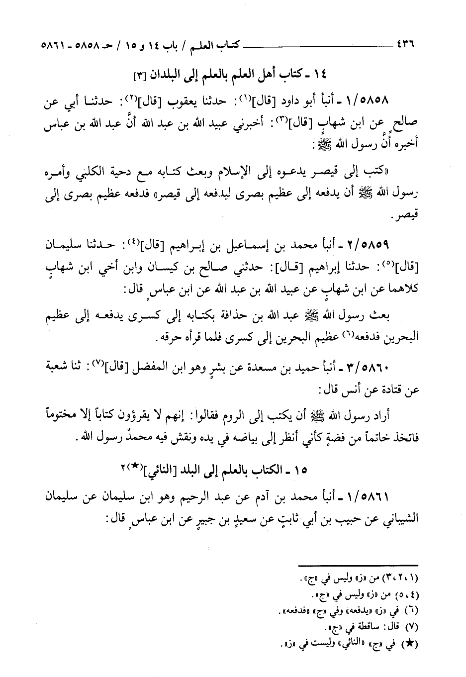 5858 - أنبأ أبو داود قال حدثنا يعقوب قال حدثنا أبي عن صالح عن بن شهاب قال أخبرني عبيد الله بن عبد الله أن عبد الله بن عباس أخبره : أن رسول الله صلى الله عليه و سلم كتب إلى قيصر يدعوه إلى الإسلام وبعث كتابه مع دحية الكلبي وأمره رسول الله صلى الله عليه و سلم أن يدفعه إلى عظيم بصرى ليدفعه إلى قيصر فدفعه عظيم بصرى إلى قيصر