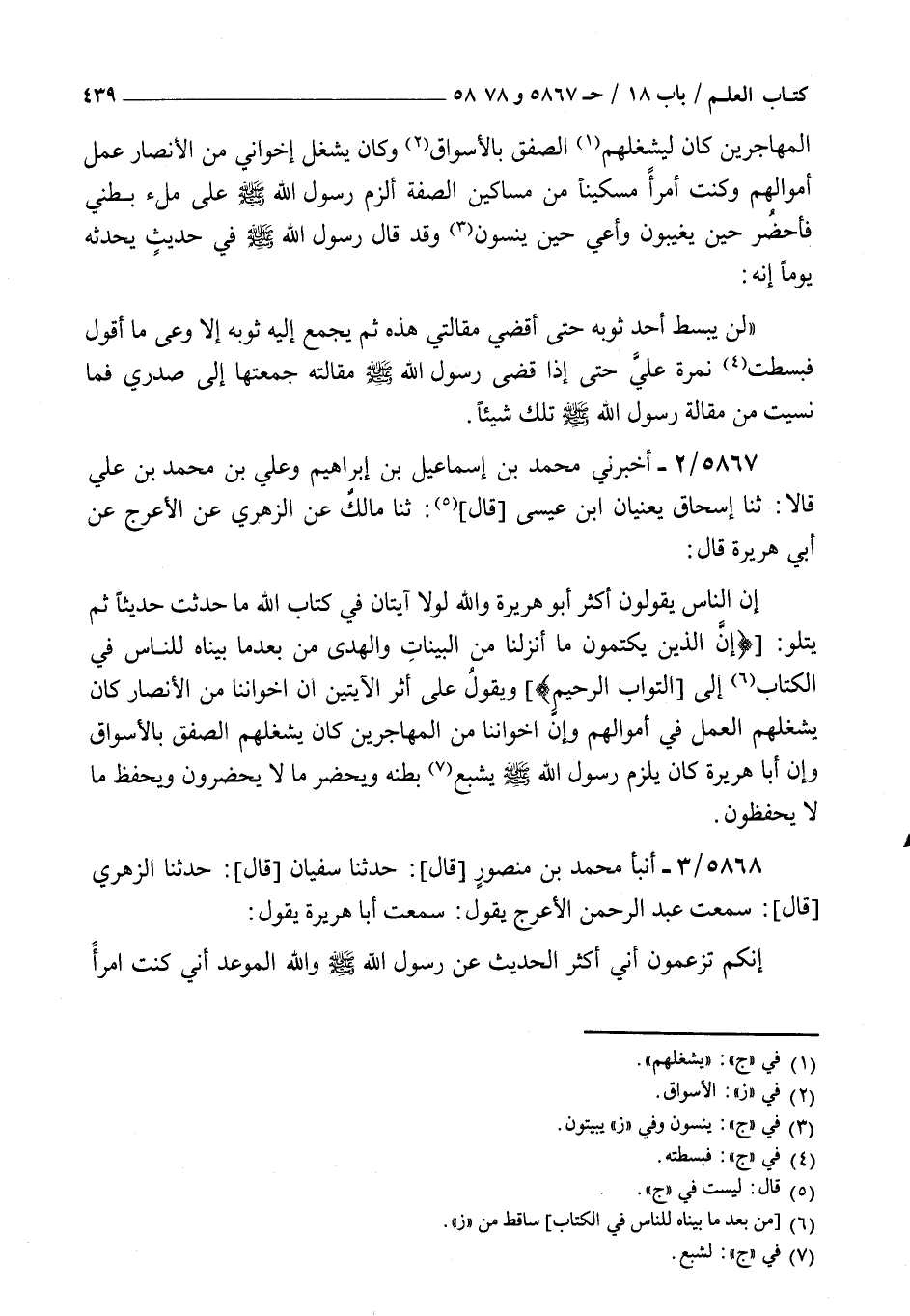 5867 - أخبرني محمد بن إسماعيل بن إبراهيم وعلي بن محمد بن علي قالا ثنا إسحاق يعنيان بن عيسى قال ثنا مالك عن الزهري عن الأعرج عن أبي هريرة قال : إن الناس يقولون أكثر أبو هريرة والله لولا آيتان في كتاب الله ما حدثت حديثا ثم يتلو إن الذين يكتمون ما أنزلنا من البينات والهدى من بعدما بيناه للناس في الكتاب إلى التواب الرحيم ويقول على أثر الآيتين ان أخواننا من الأنصار كان يشغلهم العمل في أموالهم وإن أخواننا من المهاجرين كان يشغلهم الصفق بالأسواق وإن أبا هريرة كان يلزم رسول الله صلى الله عليه و سلم يشبع بطنه ويحضر مالا يحضرون ويحفظ مالا يحفظون