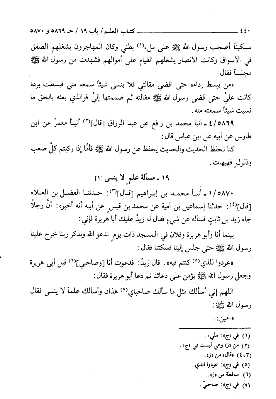 5870 - أنبأ محمد بن إبراهيم قال حدثنا الفضل بن العلاء قال حدثنا إسماعيل بن أمية عن محمد بن قيس عن أبيه أنه أخبره : أن رجلا جاء زيد بن ثابت فسأله عن شيء فقال له زيد عليك أبا هريرة فإني بينما أنا وأبو هريرة وفلان في المسجد ذات يوم ندعو الله ونذكر ربنا خرج علينا رسول الله صلى الله عليه و سلم حتى جلس إلينا فسكتنا فقال عودوا للذي كنتم فيه قال زيد فدعوت أنا وصاحبي قبل أبي هريرة وجعل رسول الله صلى الله عليه و سلم يؤمن على دعائنا ثم دعا أبو هريرة فقال اللهم إني أسألك مثل ما سألك صاحباي هذان وأسألك علما لا ينسى فقال رسول الله صلى الله عليه و سلم آمين فقال يا رسول الله ونحن نسأل الله علما لا ينسى فقال سبقكم بها الغلام الدوسي