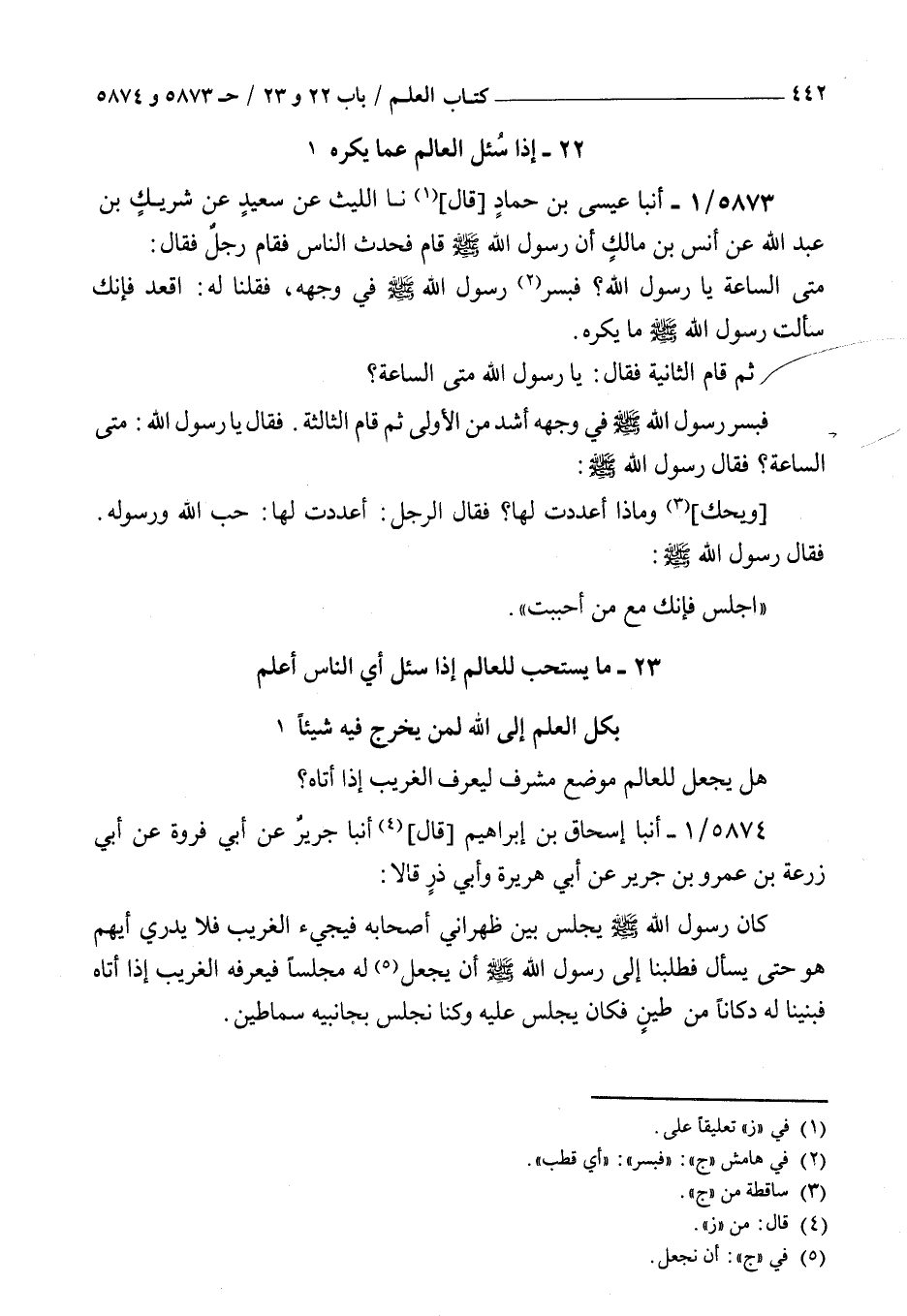 ( 23 ما يستحب للعالم إذا سئل أي الناس أعلم بكل العلم إلى الله لمن يخرج فيه شيئا هل يجعل للعالم موضع مشرف ليعرف الغريب إذا أتاه )