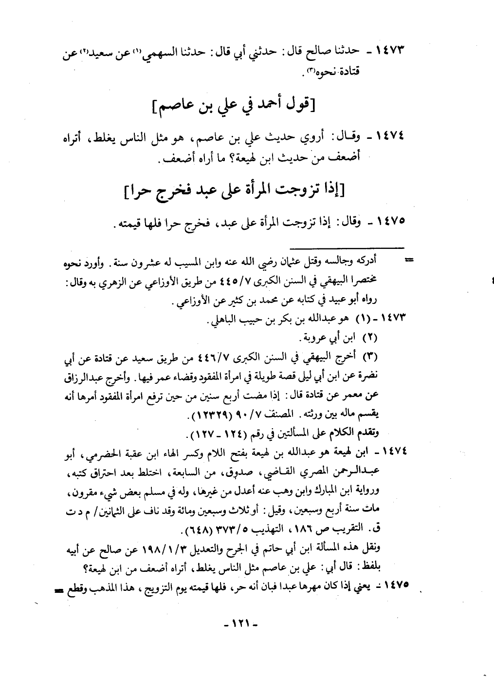 ١٤٧٤ - وَقَالَ أروي حَدِيث عَليّ بن عَاصِم هُوَ مثل النَّاس يغلط أتراه أَضْعَف من حَدِيث ابْن لَهِيعَة مَا أرَاهُ أَضْعَف