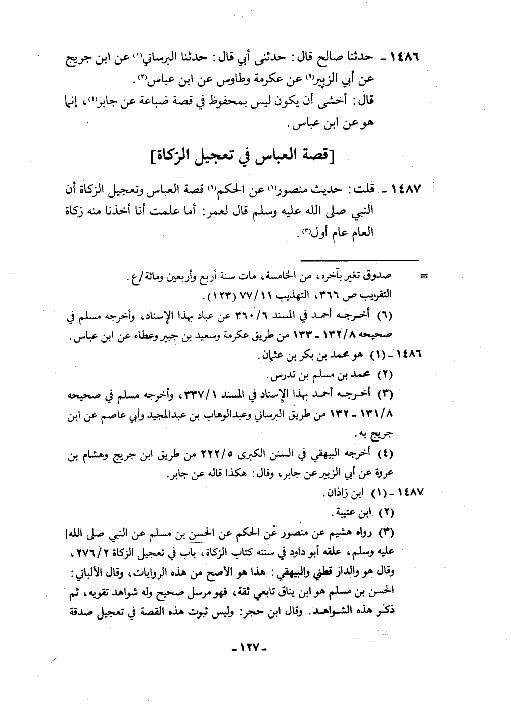 ١٤٨٧ - قلت حَدِيث مَنْصُور عَن الحكم قصَّة الْعَبَّاس وتعجيل الزَّكَاة أَن النَّبِي صلى الله عَلَيْهِ وَسلم قَالَ لعمر أما علمت أَنا أَخذنَا مِنْهُ زَكَاة الْعَام عَام أول