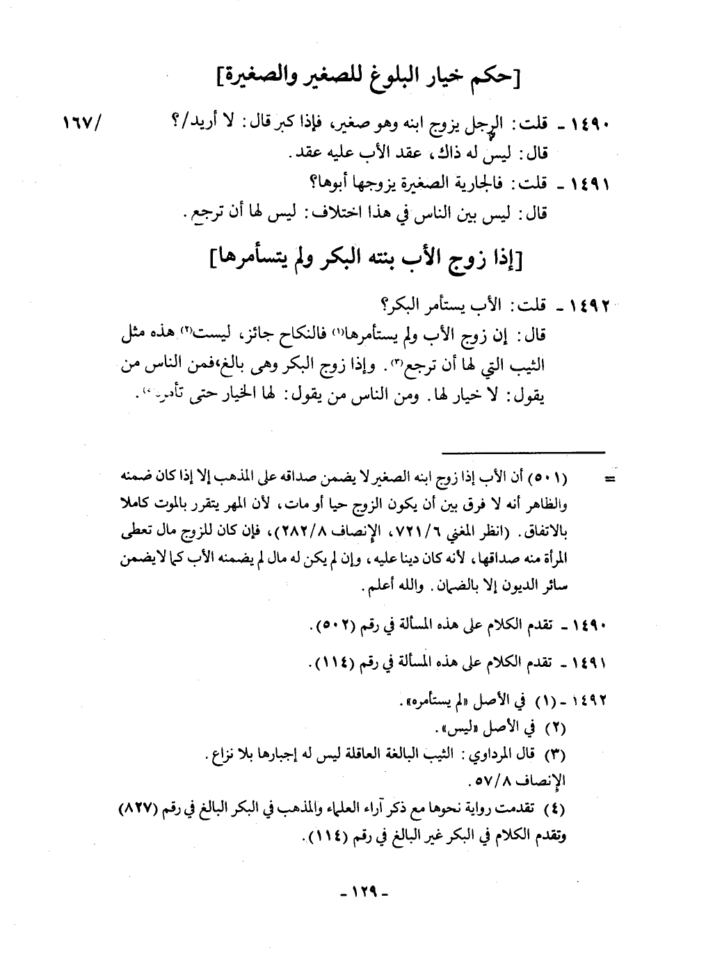 ١٤٩١ - قلت فالجارية الصَّغِيرَة يُزَوّجهَا أَبوهَا