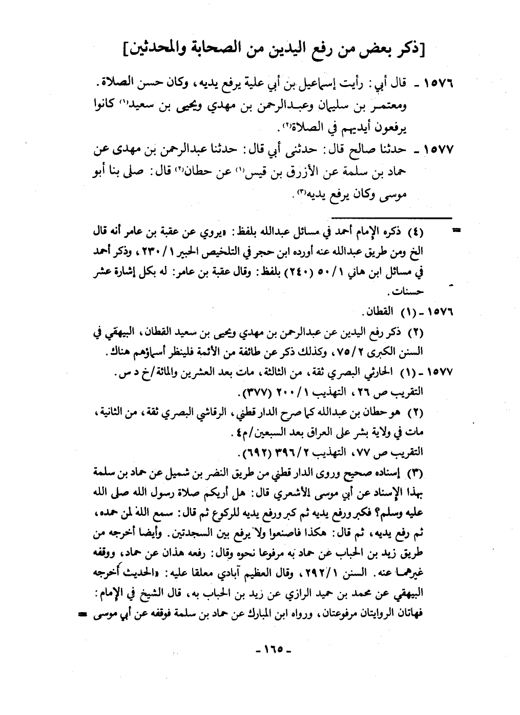 ١٥٧٦ - قَالَ أبي رَأَيْت إِسْمَاعِيل بن أبي علية يرفع يَدَيْهِ وَكَانَ حسن الصَّلَاة ومعتمر بن سُلَيْمَان وعبد الرحمن بن مهْدي وَيحيى بن سعيد كَانُوا يرفعون أَيْديهم فِي الصَّلَاة