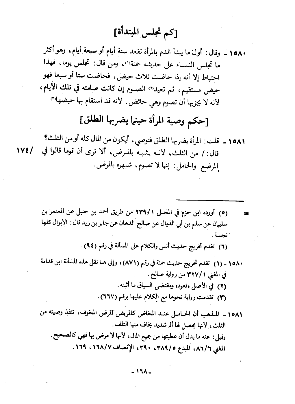 ١٥٨٠ - وَقَالَ أول مَا يبْدَأ الدَّم بِالْمَرْأَةِ تقعد سِتَّة أَيَّام أَو سَبْعَة أَيَّام وَهُوَ أَكثر مَا تجْلِس النِّسَاء على حَدِيثه حمْنَة وَمن قَالَ تجْلِس يَوْمًا فَهَذَا احْتِيَاط إِلَّا أَنه إِذا حَاضَت ثَلَاث حيض فَحَاضَت سِتا أَو سبعا فَهُوَ حيض مُسْتَقِيم ثمَّ تعيد الصَّوْم إِن كَانَت صامته فِي تِلْكَ الْأَيَّام لِأَنَّهُ لَا يجزيها أَن تَصُوم وَهِي حَائِض لِأَنَّهُ قد استقام بهَا حَيْضهَا