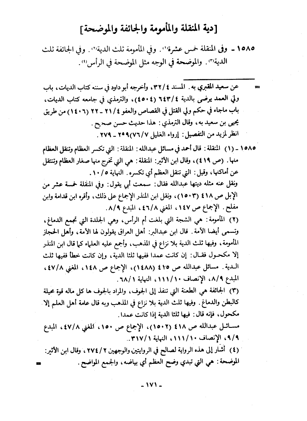 ١٥٨٥ - وَفِي المنقلة خمس عشرَة وَفِي المأمومة ثلث الدِّيَة وَفِي الْجَائِفَة ثلث الدِّيَة والموضحة فِي الْوَجْه مثل الْمُوَضّحَة فِي الرَّأْس