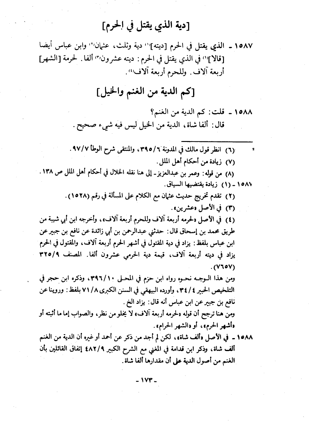 ١٥٨٧ - الَّذِي يقتل فِي الْحرم دِيَته دِيَة وَثلث عُثْمَان وَابْن عَبَّاس أَيْضا قَالَا فِي الَّذِي يقتل فِي الْحرم دِيَته عشرُون ألفا لحُرْمَة الشَّهْر أَرْبَعَة آلَاف وللحرم أَرْبَعَة آلَاف