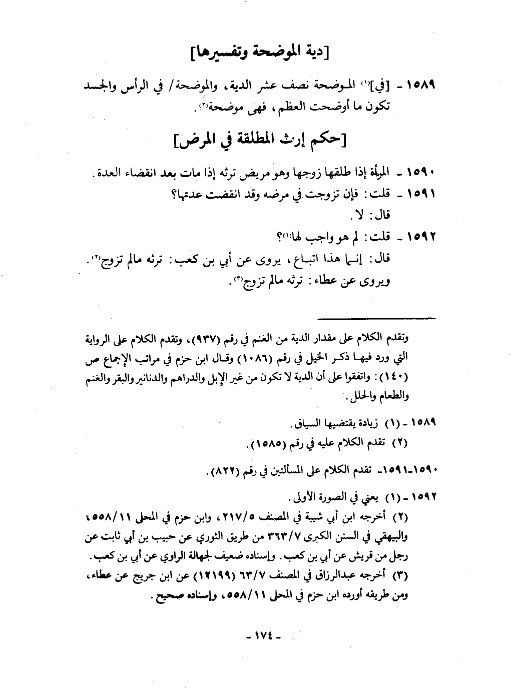 ١٥٨٩ - فِي الْمُوَضّحَة نصف عشر الدِّيَة والموضحة فِي الرَّأْس والجسد تكون مَا أوضحت الْعظم فَهِيَ مُوضحَة