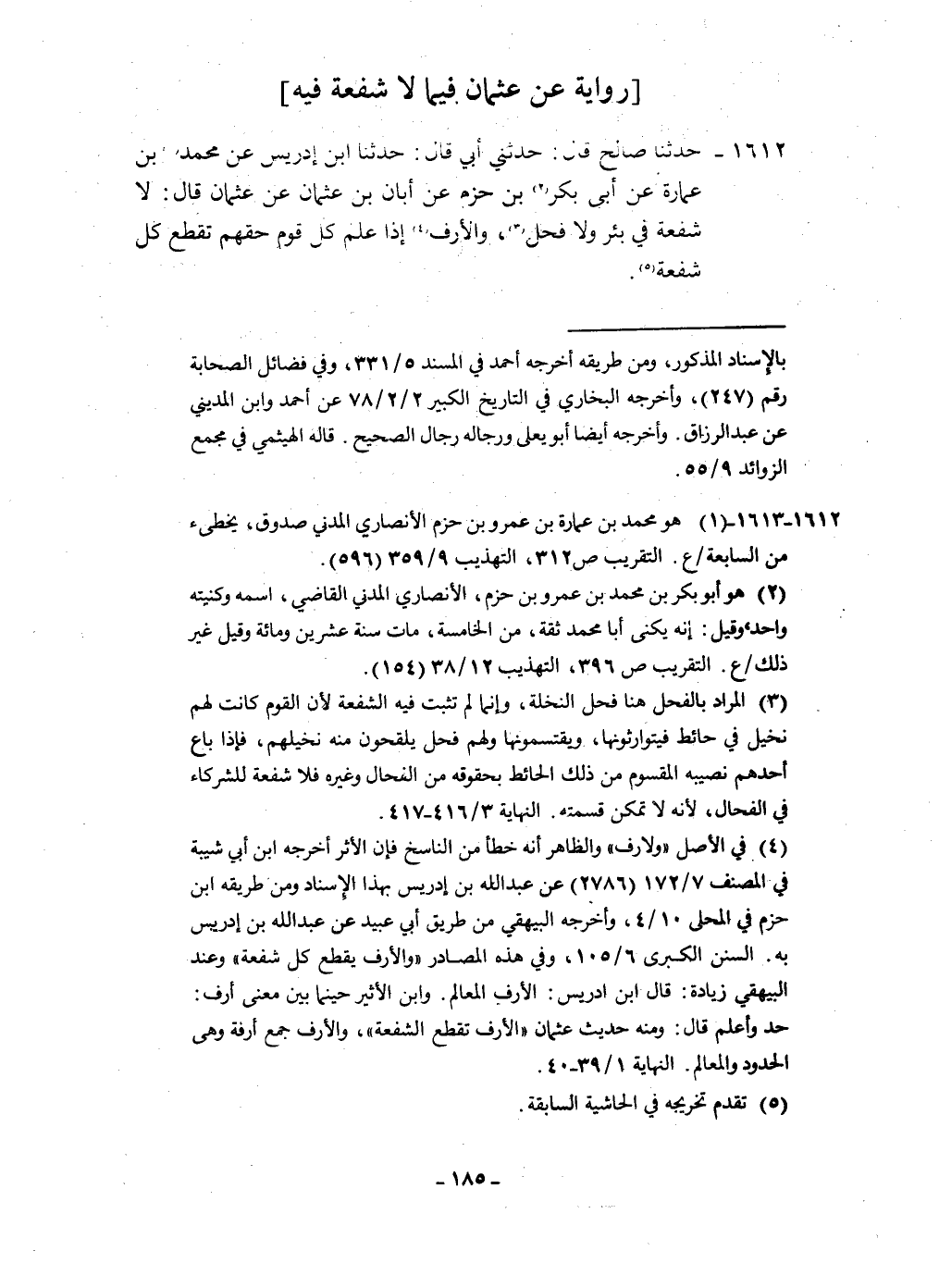 ١٦١٢ - حَدثنَا صَالح قَالَ حَدثنِي أبي قَالَ حَدثنَا ابْن إِدْرِيس عَن مُحَمَّد بن عمَارَة عَن أبي بكر بن حزم عَن أبان بن عُثْمَان عَن عُثْمَان قَالَ لَا شُفْعَة فِي بِئْر وَلَا فَحل والأرف إِذا علم كل قوم حَقهم تقطع كل شُفْعَة