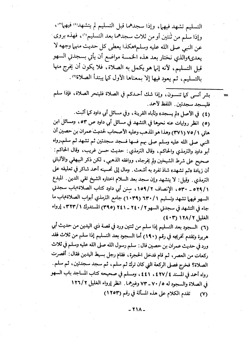 التَّسْلِيم تشهد فيهمَا وَإِذا سجدهما قبل التَّسْلِيم لم يتَشَهَّد فيهمَا وَإِذا سلم من ثِنْتَيْنِ أَو من ثَلَاث سجدهما بعد التَّسْلِيم فَهَذِهِ يرْوى عَن النَّبِي صلى الله عَلَيْهِ وَسلم هَكَذَا يعْطى كل حَدِيث مِنْهُمَا وَجهه لَا يعدى وَالَّذِي نَخْتَار بعد هَذِه الْخَمْسَة مَوَاضِع أَن يَأْتِي بسجدتي السَّهْو قبل التَّسْلِيم لِأَنَّهُ إِنَّمَا هُوَ يكمل بِهِ الصَّلَاة فَلَا يكون أَن يخرج مِنْهَا بِالتَّسْلِيمِ ثمَّ يعود فِيهَا إِلَّا بمعناها الأول كَمَا يبتدأ الصَّلَاة