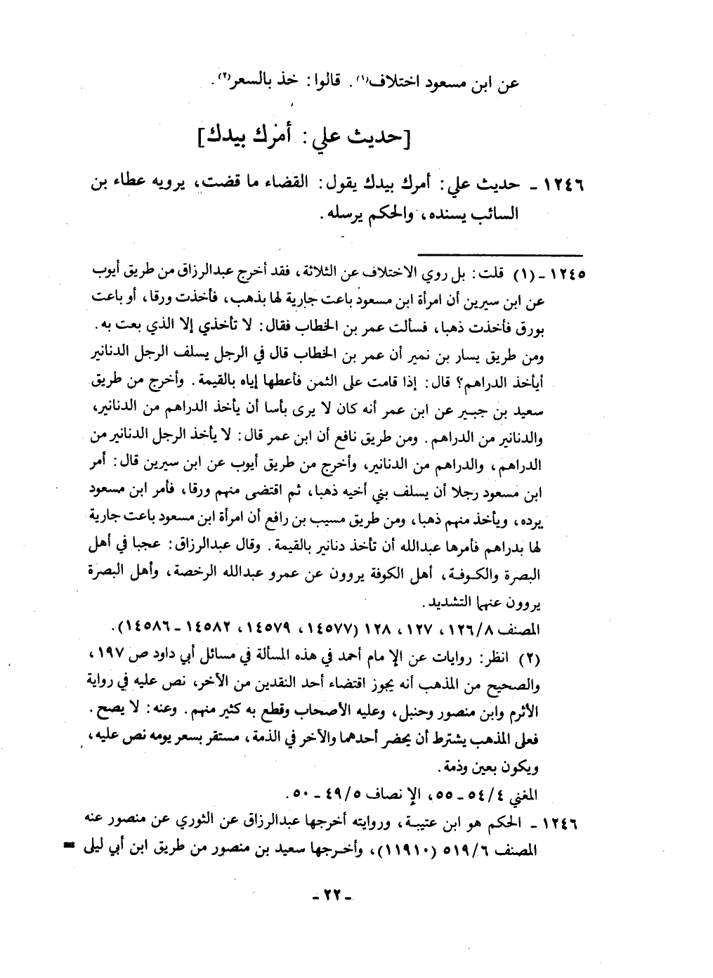 ١٢٤٦ - حَدِيث عَليّ أَمرك بِيَدِك يَقُول الْقَضَاء مَا قَضَت يرويهِ عَطاء بن السَّائِب يسْندهُ وَالْحكم يُرْسِلهُ
