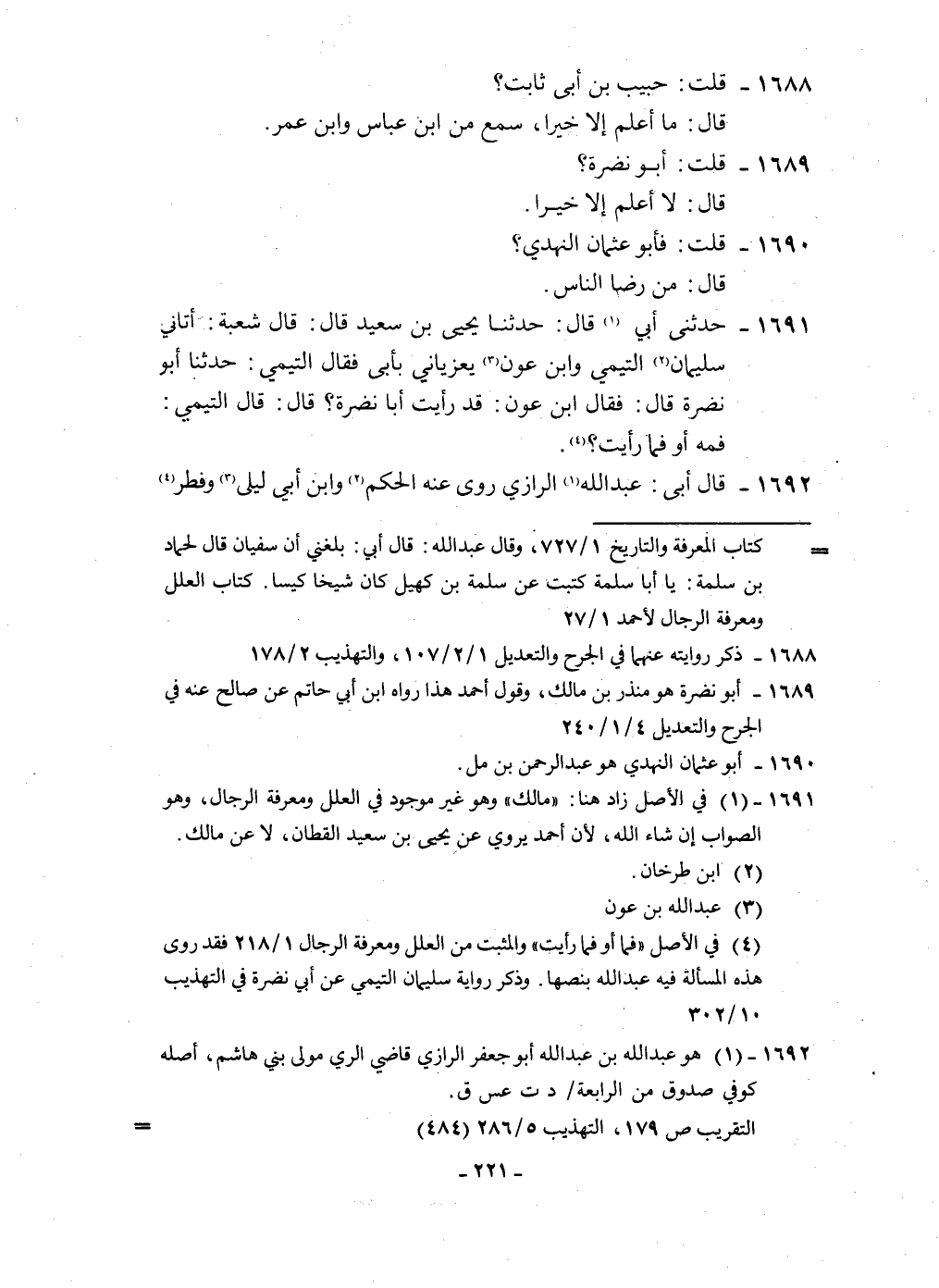 ١٦٩١ - حَدثنِي أبي قَالَ حَدثنَا يحيى بن سعيد قَالَ قَالَ شُعْبَة أَتَانِي سُلَيْمَان التَّيْمِيّ وَابْن عون يعزياني بِأبي فَقَالَ التَّيْمِيّ حَدثنَا أَبُو نَضرة قَالَ فَقَالَ ابْن عون قد رَأَيْت أَبَا نَضرة قَالَ قَالَ التَّيْمِيّ فَمه أَو فَمَا رَأَيْت