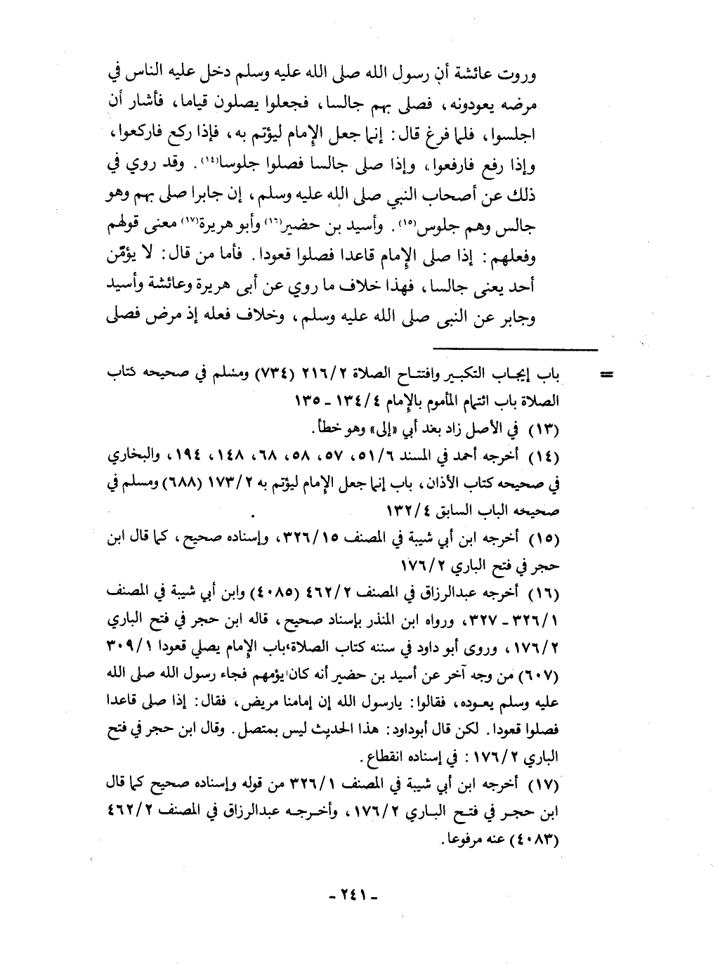 وروت عَائِشَة أَن رَسُول الله صلى الله عَلَيْهِ وَسلم دخل عَلَيْهِ النَّاس فِي مَرضه يعودونه فصلى بهم جَالِسا فَجعلُوا يصلونَ قيَاما فَأَشَارَ أَن اجلسوا فَلَمَّا فرغ قَالَ إِنَّمَا جعل الإِمَام ليؤتم بِهِ فَإِذا ركع فاركعوا وَإِذا رفع فارفعوا وَإِذا صلى جَالِسا فصلوا جُلُوسًا وَقد رُوِيَ فِي ذَلِك عَن أَصْحَاب النَّبِي صلى الله عَلَيْهِ وَسلم إِن جَابِرا صلى بهم وَهُوَ جَالس وهم جُلُوس وَأسيد بن حضير وَأَبُو هُرَيْرَة معنى قَوْلهم وفعلهم إِذا صلى الإِمَام قَاعِدا فصلوا قعُودا فَأَما من قَالَ لَا يُؤمن أحد يَعْنِي جَالِسا فَهَذَا خلاف مَا رُوِيَ عَن أبي هُرَيْرَة وَعَائِشَة وَأسيد وَجَابِر عَن النَّبِي صلى الله عَلَيْهِ وَسلم وَخلاف فعله إِذْ مرض فصلى
