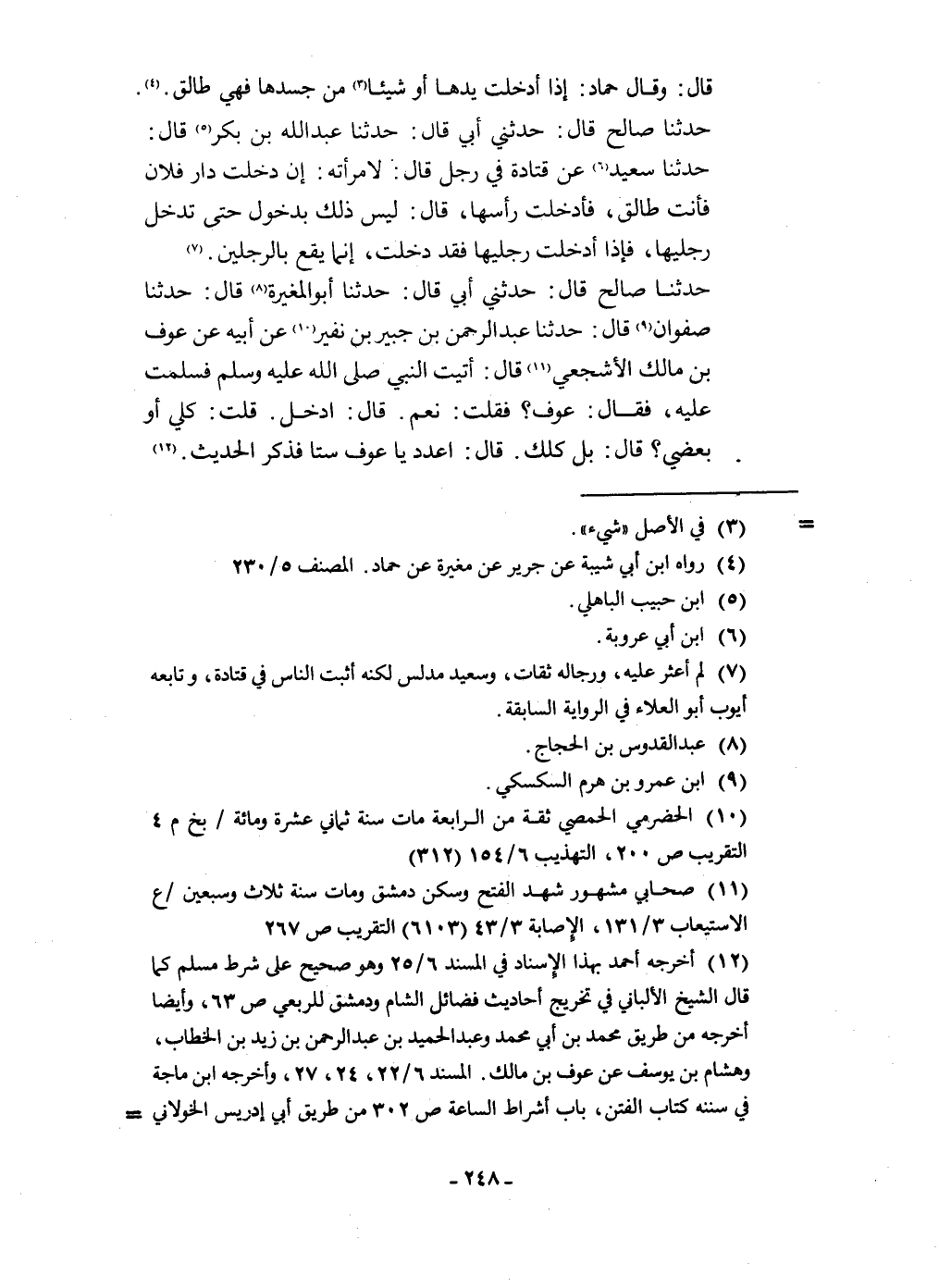 حَدثنَا صَالح قَالَ حَدثنِي أبي قَالَ حَدثنَا أَبُو الْمُغيرَة قَالَ حَدثنَا صَفْوَان قَالَ حَدثنَا بن جُبَير بن نفير عَن أَبِيه عَن عَوْف بن مَالك الْأَشْجَعِيّ قَالَ أتيت النَّبِي صلى الله عَلَيْهِ وَسلم فَسلمت عَلَيْهِ فَقَالَ عَوْف فَقلت نعم قَالَ ادخل قلت كلي أَو بَعْضِي قَالَ بل كلك قَالَ اعدد يَا عَوْف سِتا فَذكر الحَدِيث