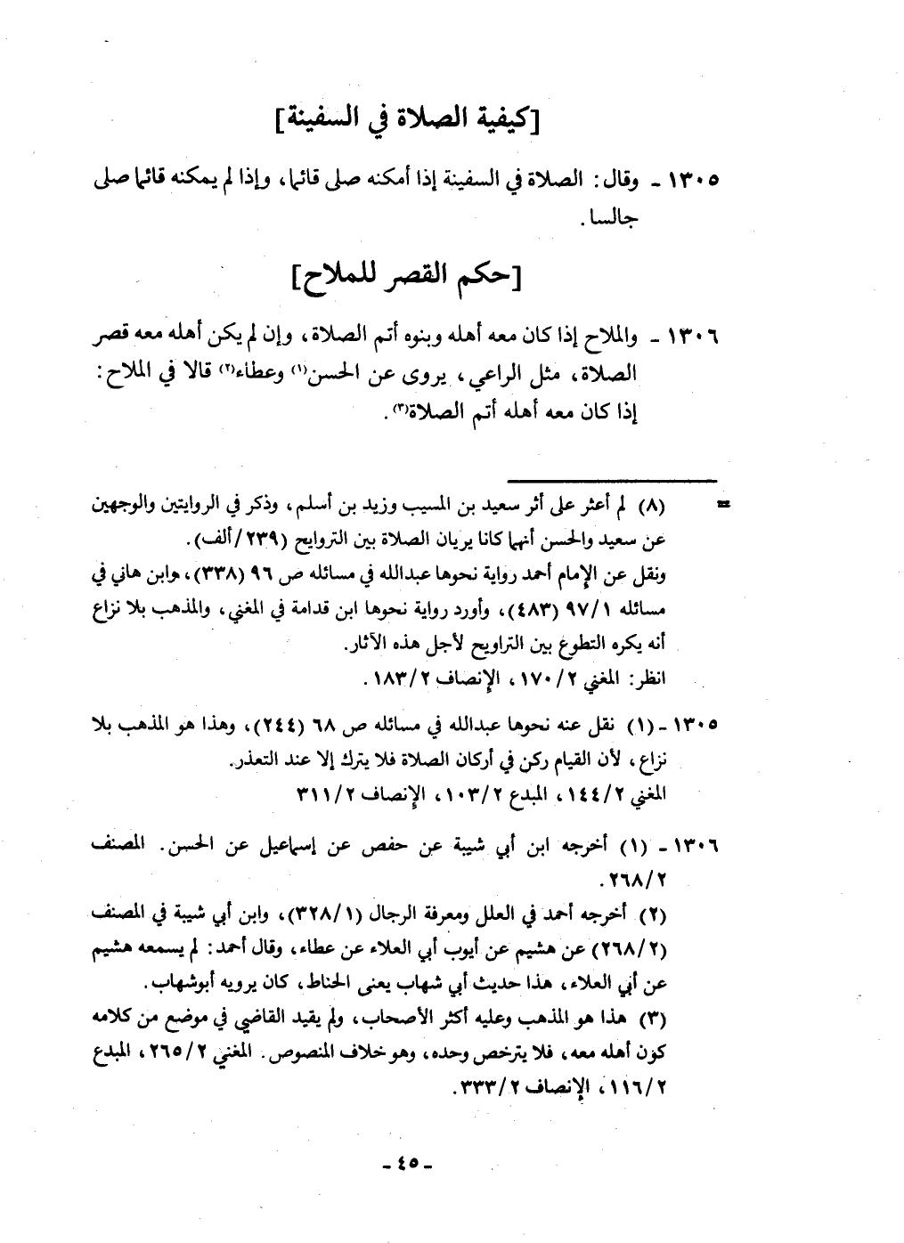 ١٣٠٦ - والملاح إِذا كَانَ مَعَه أَهله وَبَنوهُ أتم الصَّلَاة وَإِن لم يكن أَهله مَعَه قصر الصَّلَاة مثل الرَّاعِي يرْوى عَن الْحسن وَعَطَاء قَالَا فِي الملاح إِذا كَانَ مَعَه أَهله أتم الصَّلَاة