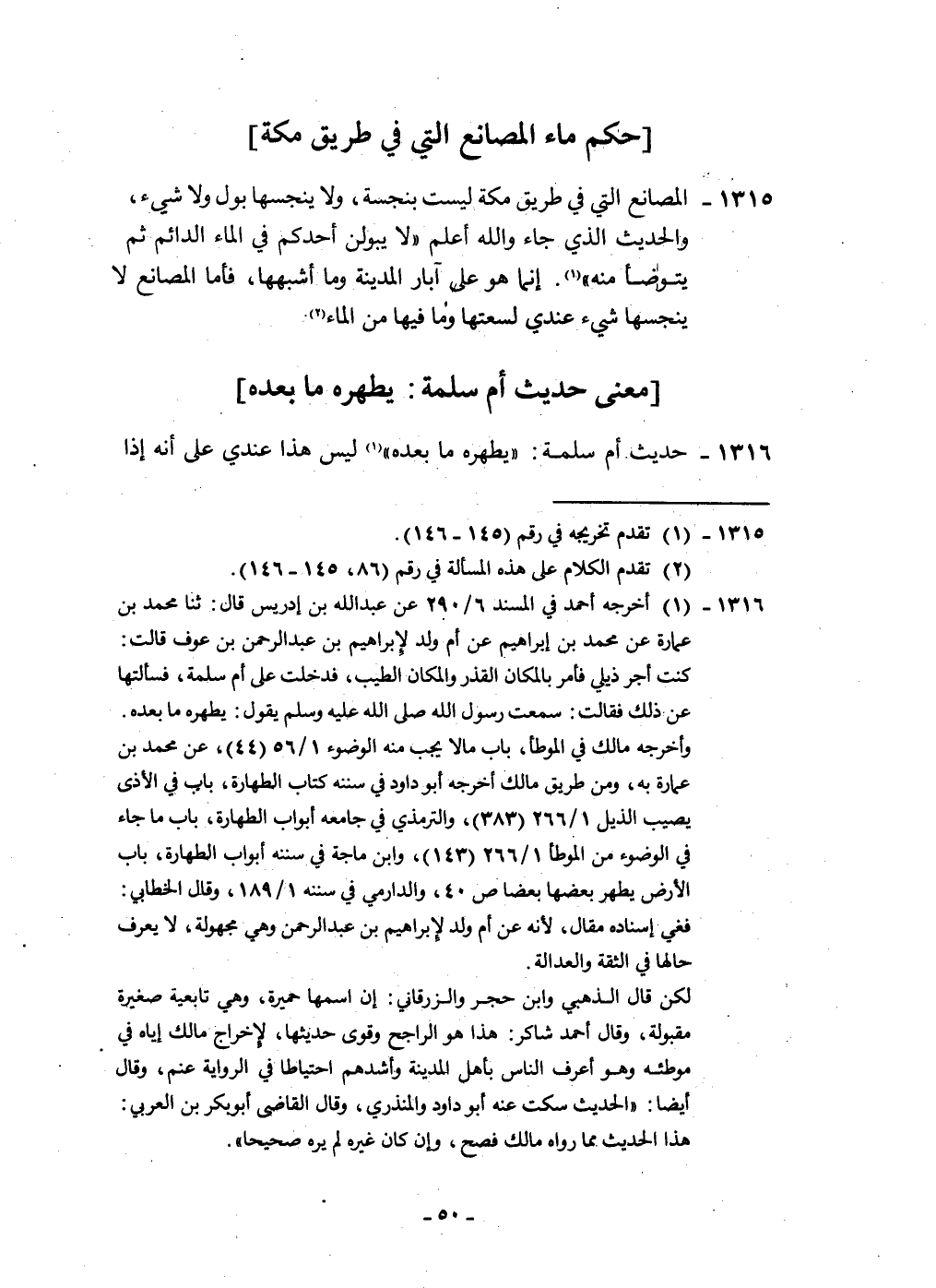 ١٣١٥ - المصانع الَّتِي فِي طَرِيق مَكَّة لَيست بنجسة وَلَا ينجسها بَوْل وَلَا شَيْء والْحَدِيث الَّذِي جَاءَ وَالله أعلم لَا يبولن أحدكُم فِي المَاء الدَّائِم ثمَّ يتَوَضَّأ مِنْهُ إِنَّمَا هُوَ على آبار الْمَدِينَة وَمَا أشبههَا فَأَما المصانع لَا ينجسها شَيْء عِنْدِي لسعتها وَمَا فِيهَا من المَاء