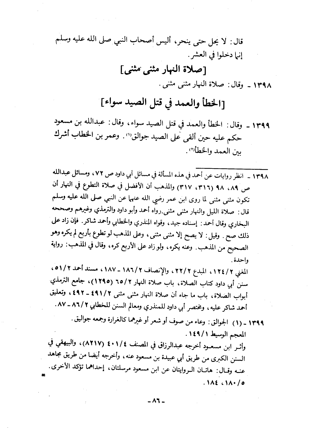 ١٣٩٩ - وَقَالَ الْخَطَأ والعمد فِي قتل الصَّيْد سَوَاء وَقَالَ عبد الله بن مَسْعُود حكم عَلَيْهِ حِين ألْقى على الصَّيْد جوالق وَعمر بن الْخطاب أشرك بَين الْعمد وَالْخَطَأ