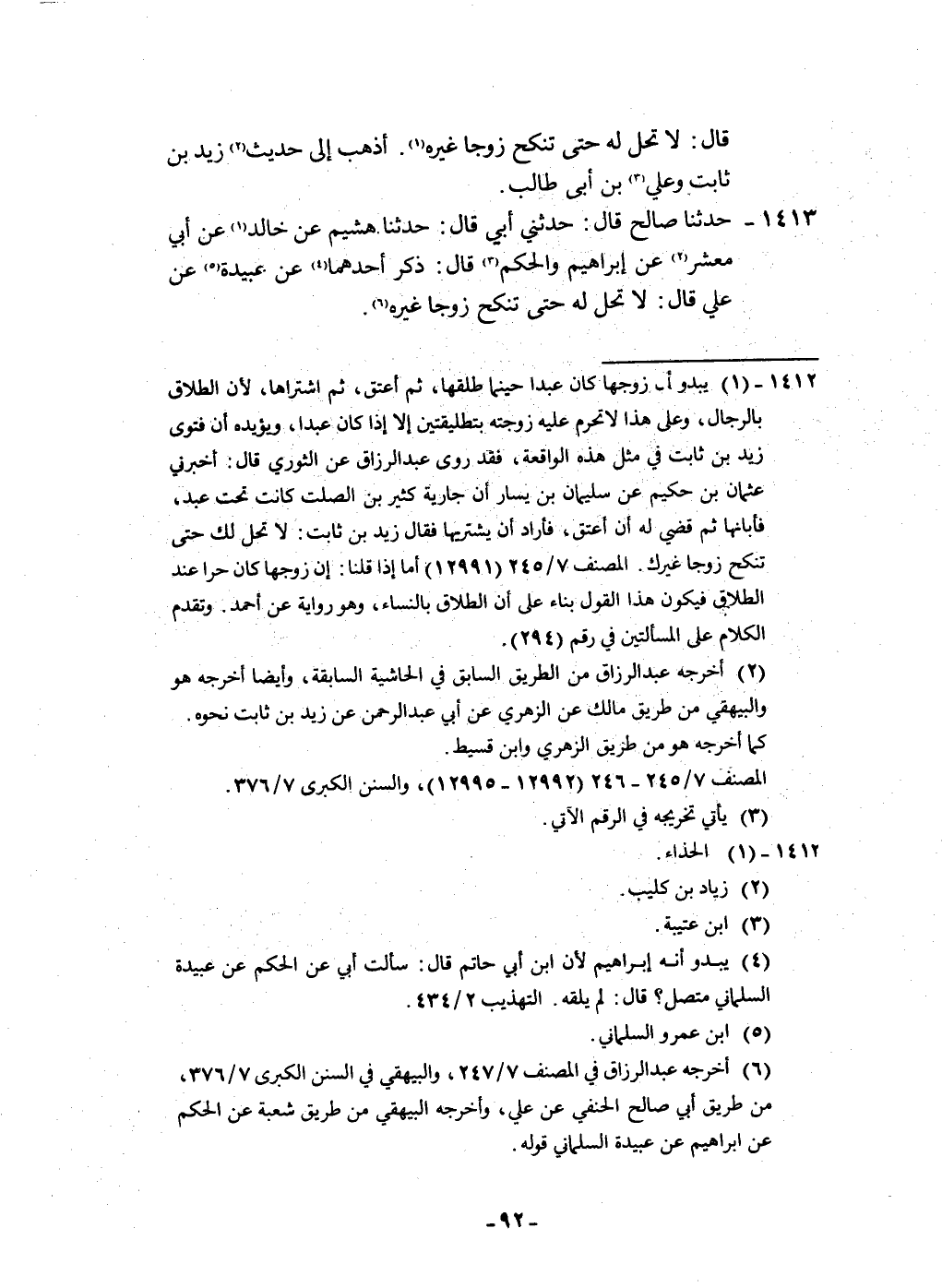 ١٤١٣ - حَدثنَا صَالح قَالَ حَدثنِي أبي قَالَ حَدثنَا هشيم عَن خَالِد عَن أبي معشر عَن إِبْرَاهِيم وَالْحكم قَالَ ذكر أَحدهمَا عَن عُبَيْدَة عَن عَليّ قَالَ لَا تحل لَهُ حَتَّى تنْكح زوجا غَيره