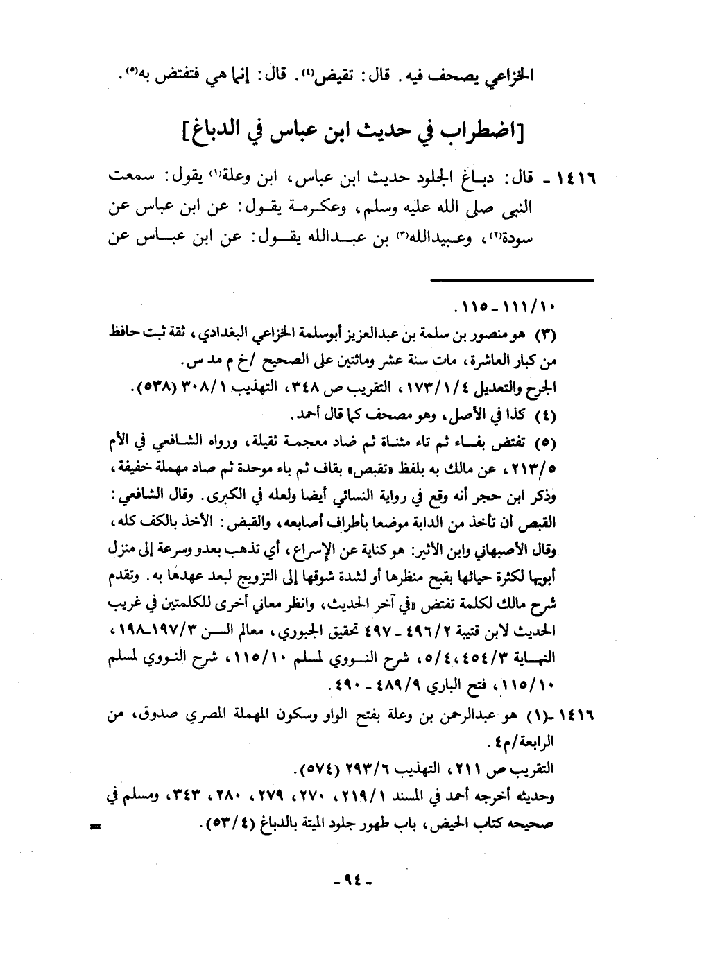 ١٤١٦ - قَالَ دباغ الْجُلُود حَدِيث ابْن عَبَّاس ابْن وَعلة يَقُول سَمِعت النَّبِي صلى الله عَلَيْهِ وَسلم وَعِكْرِمَة يَقُول عَن ابْن عَبَّاس عَن سَوْدَة وعبيد الله بن عبد الله يَقُول عَن ابْن عَبَّاس عَن