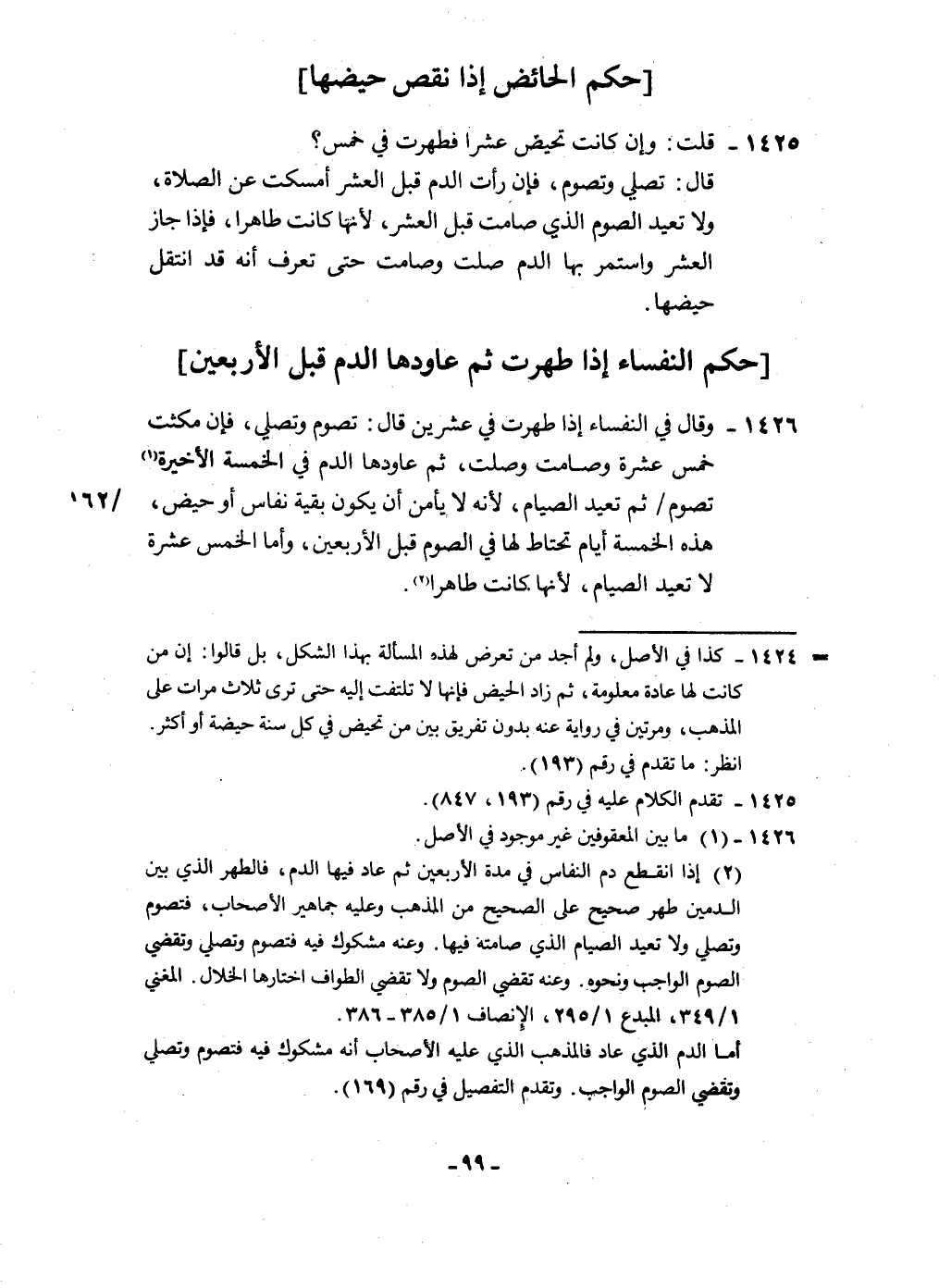 ١٤٢٦ - وَقَالَ فِي النُّفَسَاء إِذا طهرت فِي عشْرين قَالَ تَصُوم وَتصلي فَإِن مكثت خمس عشرَة وصامت وصلت ثمَّ عاودها الدَّم فِي الْخَمْسَة الْأَخِيرَة تَصُوم ثمَّ تعيد الصّيام لِأَنَّهُ لَا يَأْمَن أَن يكون بَقِيَّة نِفَاس أَو حيض هَذِه الْخَمْسَة أَيَّام تحتاط لَهَا فِي الصَّوْم قبل الْأَرْبَعين وَأما الْخمس عشرَة لَا تعيد الصّيام لِأَنَّهَا كَانَت طَاهِرا