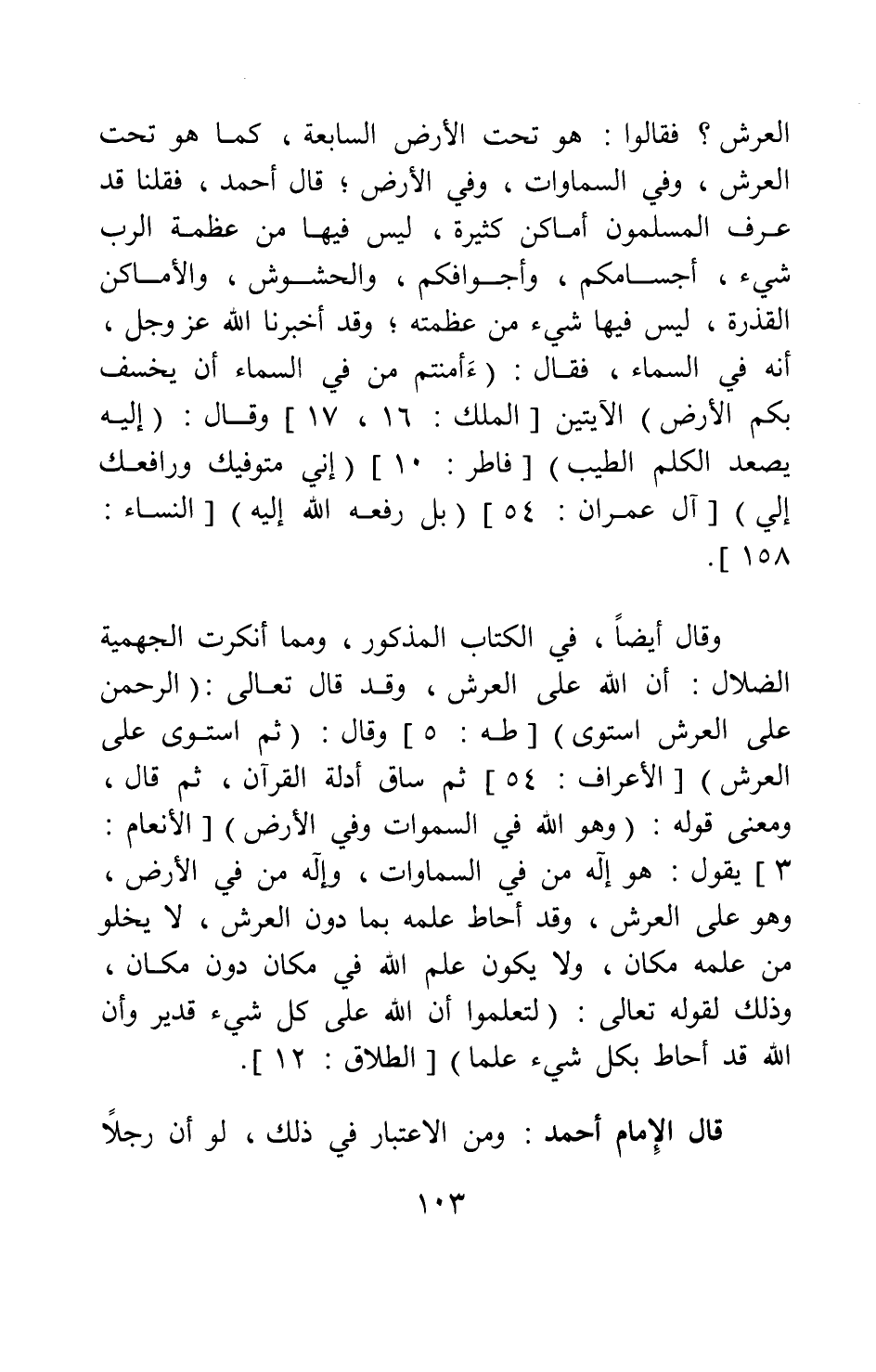 وقال أيضا في الكتاب المذكور:، ومما أنكرت الجهمية الضلال أن الله على العرش، وقد قال تعالى: {الرَّحْمَنُ عَلَى الْعَرْشِ اسْتَوَى} [سورة طه آية: 5] ، وقال: {ثُمَّ اسْتَوَى عَلَى الْعَرْشِ} [سورة الأعراف آية: 54] . ثم ساق أدلة القرآن، ثم قال: ومعنى قوله: {وَهُوَ اللَّهُ فِي السَّمَاوَاتِ وَفِي الْأَرْضِ} [سورة الأنعام آية: 3] ، يقول: هو إله من في السماوات، وإله من في الأرض، وهو على العرش، وقد أحاط علمه بما دون العرش، لا يخلو من علمه مكان، ولا يكون علم الله في مكان دون مكان، وذلك لقوله تعالى: {لِتَعْلَمُوا أَنَّ اللَّهَ عَلَى كُلِّ شَيْءٍ قَدِيرٌ وَأَنَّ اللَّهَ قَدْ أَحَاَطَ بِكُلِّ شَيْءٍ عِلْماً} [سورة الطلاق آية: 12] .