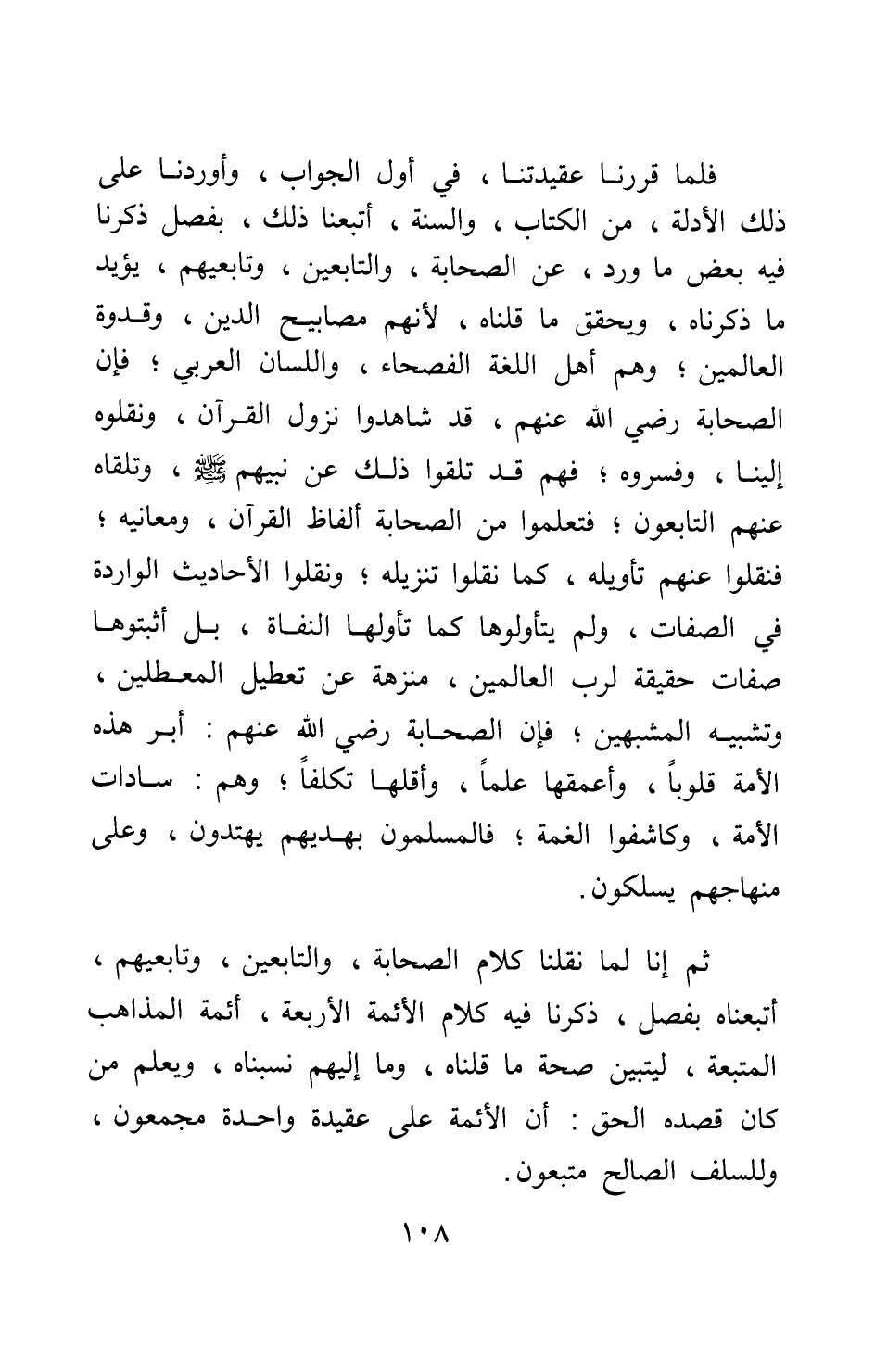 ثم إنا لما نقلنا كلام الصحابة، والتابعين، وتابعيهم، أتبعناه بفصل ذكرنا فيه كلام الأئمة الأربعة، أئمة المذاهب المتبعة، ليتبين صحة ما قلناه، وما إليهم نسبناه، ويعلم من كان قصده الحق أن الأئمة على عقيدة واحدة مجمعون، وللسلف الصالح متبعون.