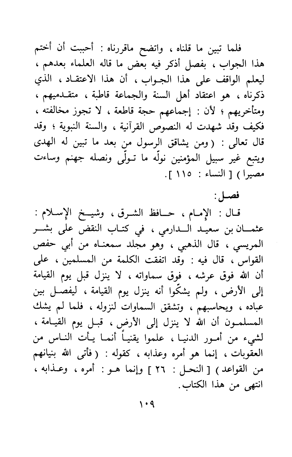 فصل: قال الإمام حافظ الشرق، وشيخ الإسلام: عثمان بن سعيد الدارمي، في كتاب النقض على بشر المريسي، قال الذهبي: وهو مجلد سمعناه من أبي حفص القواس قال فيه: وقد اتفقت الكلمة من المسلمين، على أن الله فوق عرشه فوق سماواته، لا ينْزل قبل يوم القيامة إلى الأرض، ولم يشُكّوا أنه ينْزل يوم القيامة، ليفصل بين عباده ويحاسبهم، وتشقق السماوات لنُزوله، فلما لم يشك المسلمون أن الله لا ينْزل إلى الأرض قبل يوم القيامة لشيء من أمور الدنيا، علموا يقينا أن ما يأتي الناس من العقوبات، إنما هو أمره وعذابه، كقوله: {فَأَتَى اللَّهُ بُنْيَانَهُمْ مِنَ الْقَوَاعِدِ} [سورة النحل آية: 26] وإنما هو: أمره وعذابه، انتهى من هذا الكتاب.