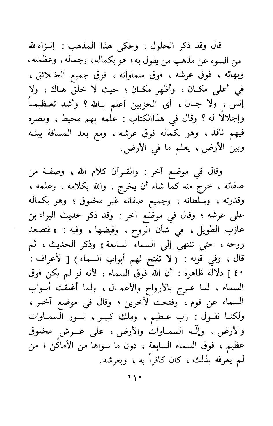 قال وقد ذكر الحلول وحكى هذا المذهب، إنزاه لله من السوء عن مذهب من يقول به هو بكماله وجماله، وعظمته وبهائه، فوق عرشه، فوق سماواته، فوق جميع الخلائق، في أعلى مكان وأظهر مكان، حيث لا خلق هناك ولا إنس، ولا جان، أي الحزبين أعلم بالله؟ وأشد تعظيما وإجلالا له؟ وقال في هذا الكتاب: علمه بهم محيط، وبصره فيهم نافذ، وهو بكماله فوق عرشه، ومع بعد المسافة بينه وبين الأرض، يعلم ما في الأرض.