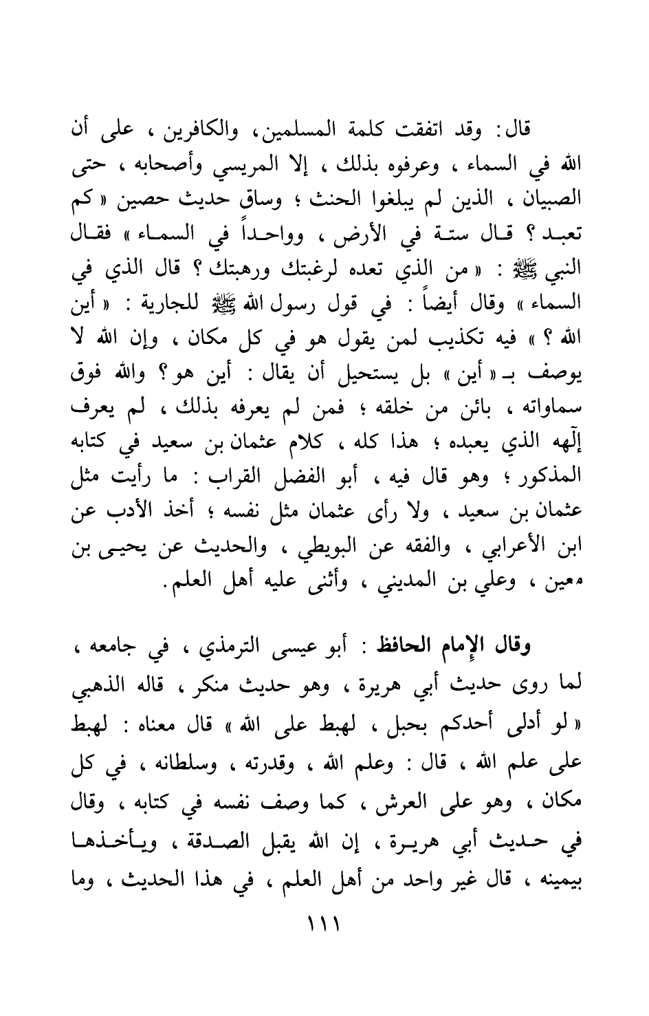 وقال الإمام الحافظ أبو عيسى الترمذي في جامعه، لما روى حديث أبي هريرة، وهو حديث منكر، قاله الذهبي: " لو أدلى أحدكم بحبل، لهبط على الله "2 قال معناه: لهبط على علم الله، قال: وعلم الله، وقدرته، وسلطانه، في كل مكان، وهو على العرش، كما وصف نفسه في كتابه، وقال في حديث أبي هريرة: " إن الله يقبل الصدقة، ويأخذها بيمينه "3 قال غير واحد من أهل العلم في هذا الحديث وما
