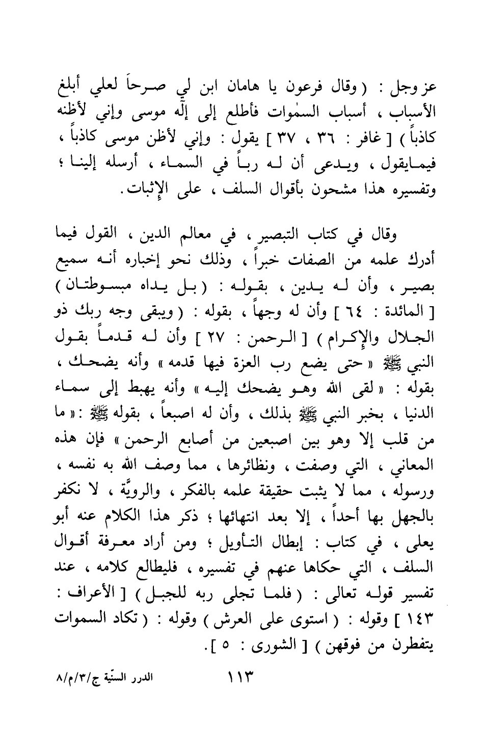 وقال في كتاب التبصير في معالم الدين: القول فيما أدرك علمه من الصفات خبرا، وذلك نحو إخباره أنه سميع بصير، وأن له يدين بقوله: {بَلْ يَدَاهُ مَبْسُوطَتَانِ} [سورة المائدة آية: 64] ، وأن له وجها بقوله: {وَيَبْقَى وَجْهُ رَبِّكَ ذُو الْجَلالِ وَالْأِكْرَامِ} [سورة الرحمن آية: 27] ، وأن له قدما بقول النبي صلى الله عليه وسلم " حتى يضع رب العزة فيها قدمه "1، وأنه يضحك بقوله: "لقي الله وهو يضحك إليه "، وأنه يهبط إلى سماء الدنيا، بخبر النبي صلى الله عليه وسلم بذلك، وأن له أصبعا بقوله صلى الله عليه وسلم: " ما من قلب إلا وهو بين إصبعين من أصابع الرحمن "2 فإن هذه المعاني، التي وصفت ونظائرها، مما وصف الله به نفسه ورسوله، مما لا يثبت حقيقة علمه بالفكر والروية، لا نكفر بالجهل بها أحدا إلا بعد انتهائها. ذكر هذا الكلام عنه أبو يعلى في كتاب: إبطال التأويل. ومن أراد معرفة أقوال السلف التي حكاها عنهم في تفسيره فليطالع كلامه عند تفسير قوله تعالى: {فَلَمَّا تَجَلَّى رَبُّهُ لِلْجَبَلِ} [سورة الأعراف آية: 143] ، وقوله: {اسْتَوَى عَلَى الْعَرْشِ} [سورة الأعراف آية: 54] ، وقوله: {تَكَادُ السَّمَاوَاتُ يَتَفَطَّرْنَ مِنْ فَوْقِهِنَّ} [سورة الشورى آية: 5] .