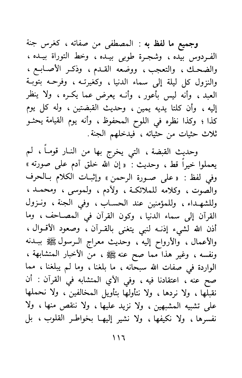 وجميع ما لفظ به المصطفى من صفاته، كغرس جنة الفردوس بيده، وشجرة طوبى بيده، وخط التوراة بيده، والضحك، والتعجب، ووضعه القدم، وذكر الأصابع، والنّزول كل ليلة إلى سماء الدنيا، وكغيرته، وفرحه بتوبة العبد، وأنه ليس بأعور، وأنه يعرض عما يكره ولا ينظر إليه، وأن كلتا يديه يمين، وحديث القبضتين، وله كل يوم كذا وكذا نظرة في اللوح المحفوظ، وأنه يوم القيامة يحثو ثلاث حثيات من حثياته، فيدخلهم الجنة.
