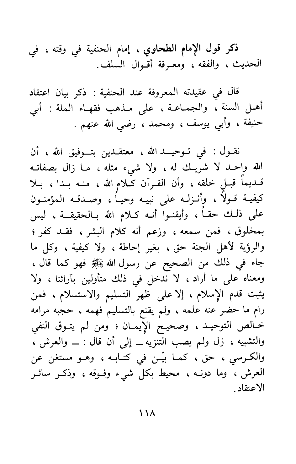 نقول في توحيد الله، معتقدين بتوفيق الله: أن الله واحد لا شريك له، ولا شيء مثله، ما زال بصفاته قديما قبل خلقه، وأن القرآن كلام الله، منه بدأ، بلا كيفية قولا، وأنزله على نبيه وحيا، وصدقه المؤمنون على ذلك حقا، وأيقنوا أنه كلام الله بالحقيقة، ليس بمخلوق، فمن سمعه، وزعم أنه كلام البشر، فقد كفر; والرؤية لأهل الجنة حق، بغير إحاطة ولا كيفية، وكل ما جاء في ذلك من الصحيح عن رسول الله صلى الله عليه وسلم فهو كما قال، ومعناه على ما أراد، لا ندخل في ذلك متأولين بآرائنا، ولا يثبت قدم الإسلام، إلا على ظهر التسليم والاستسلام، فمن رام ما حضر عنه علمه، ولم يقنع بالتسليم فهمه، حجبه مرامه خالص التوحيد، وصحيح الإيمان; ومن لم يتوق النفي والتشبيه، زل ولم يصب التنْزيه ... إلى أن قال: والعرش، والكرسي، حق، كما بين في كتابه، وهو مستغن عن العرش، وما دونه، محيط بكل شيء وفوقه، وذكر سائر الاعتقاد.